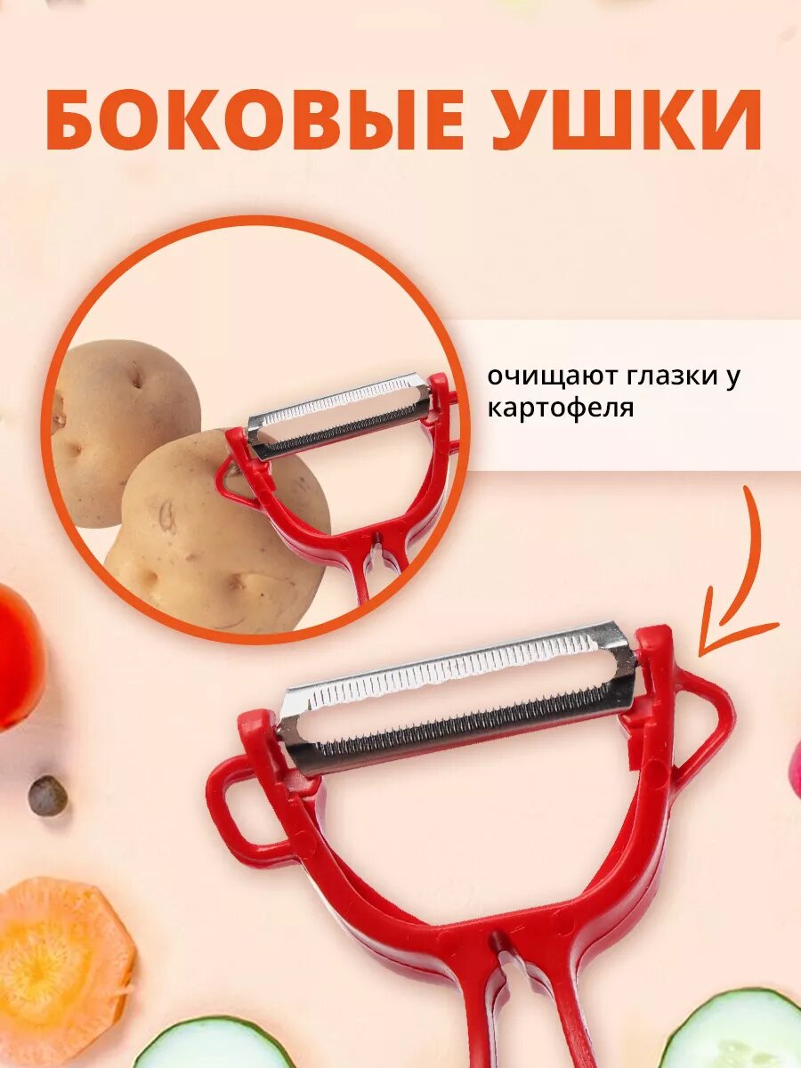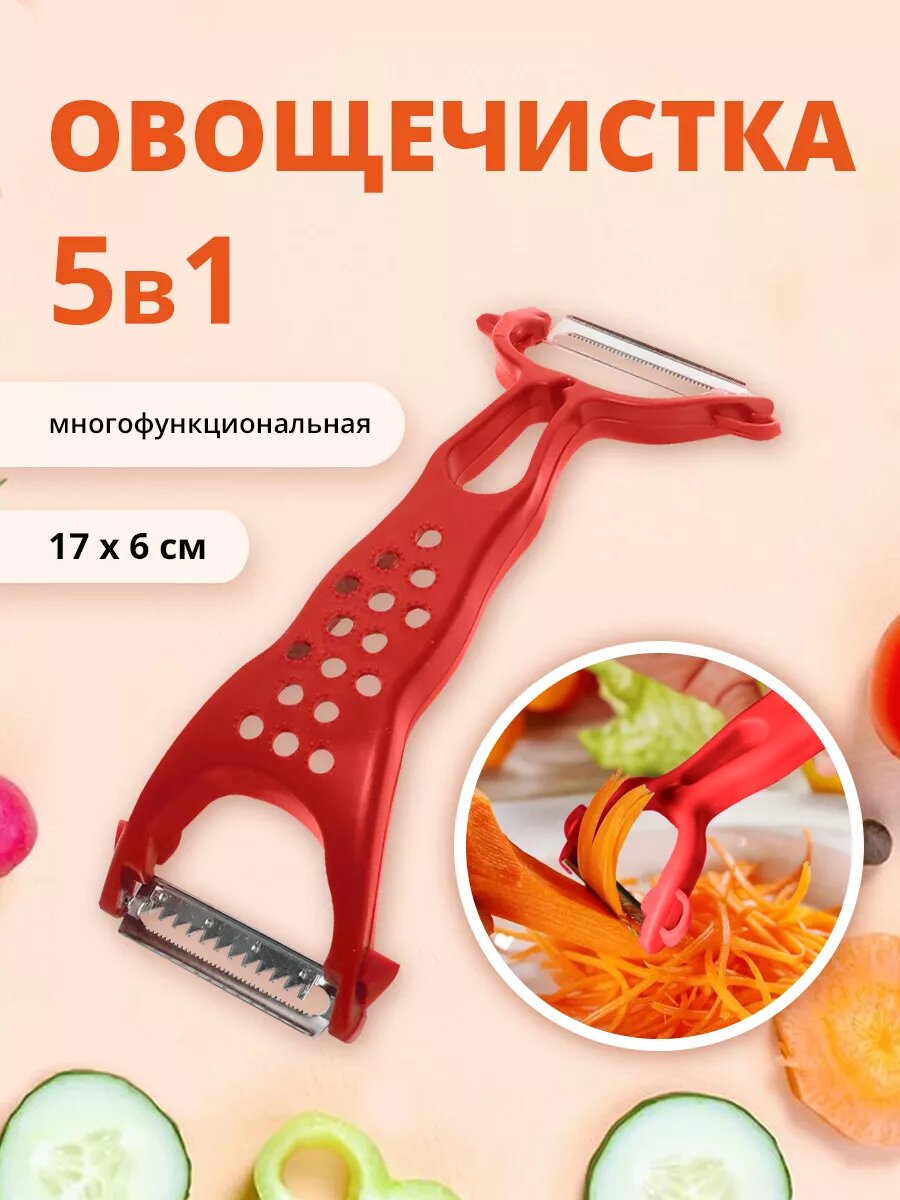 Овощечистка ручная, универсальный нож для чистки, нарезки овощей 5в1, цвет красный интересное: