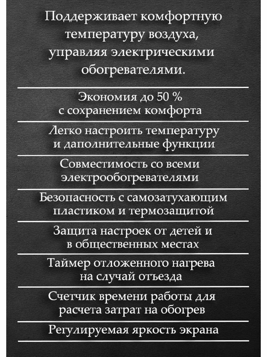 | Дополнительная информация | Терморегулятор Технический паспорт, инструкция по установке и эксплуатации, гарантийный талон Упаковочная коробка |