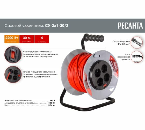 СохранитьУдлинитель силовой на катушке, СУ-2х1-30/2 (с выкл., 4 розетки) Ресанта интересное:
