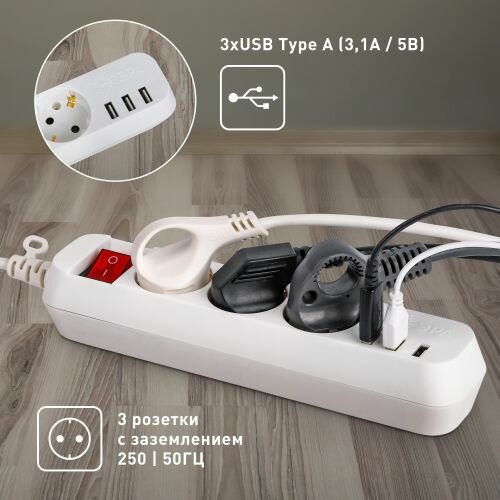 Удлинитель электрический 3 розетки, 3 USB, 1,5м 10А ЭРА с заземлением, с выключателем, белы