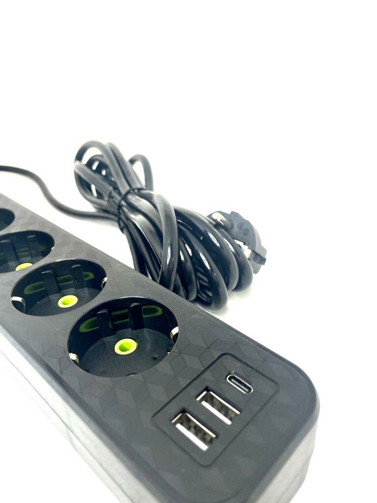 Сетевой фильтр с 4 розетками 2 USB + 1 Type-C Удлинитель с предохранителем, 3 метра