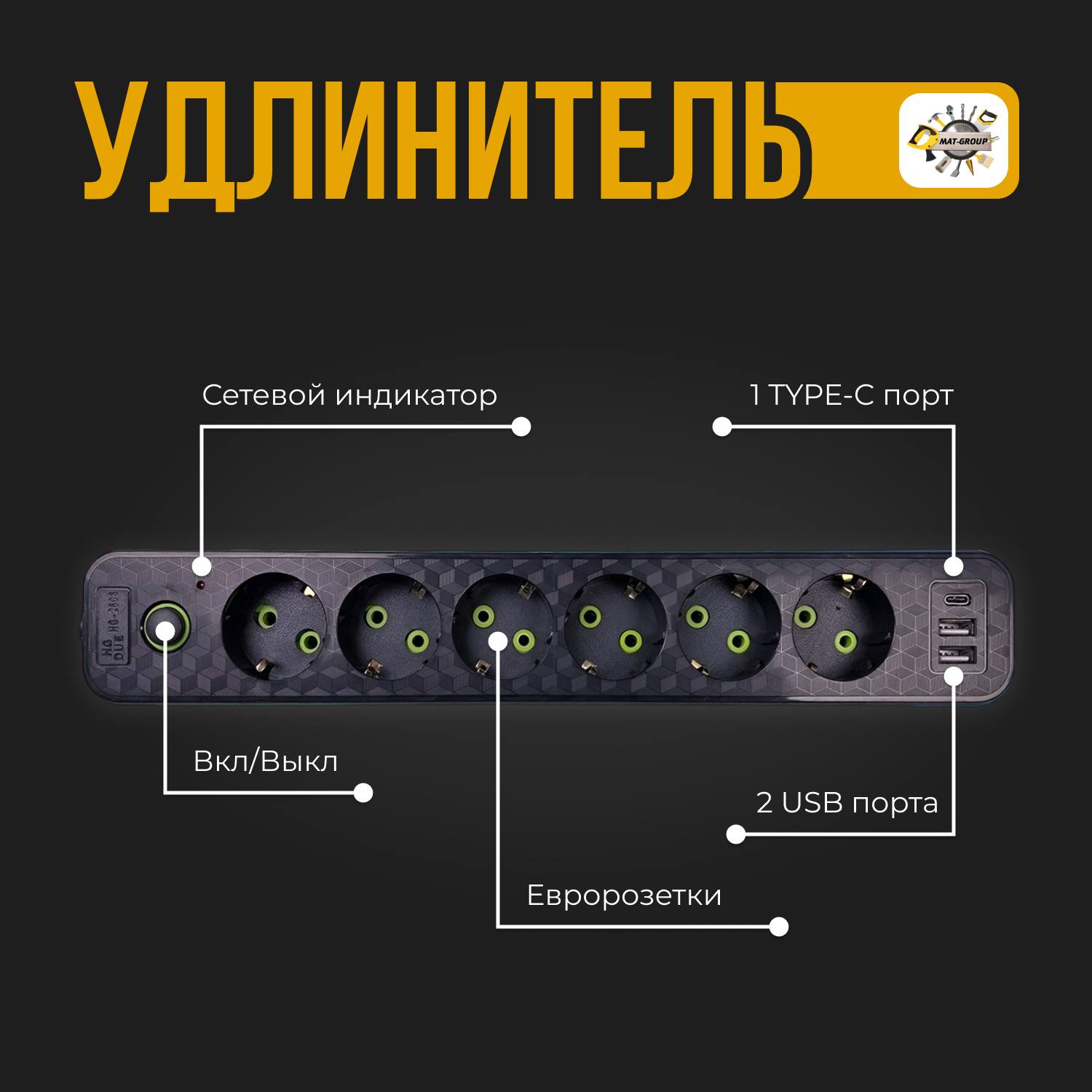СохранитьСетевой фильтр с 6 гнездами и 2 USB 1 Type-C, удлинитель бытовой 3метра 2 USB проёма, Универсальный удлинитель для дома 3 м 2 USB 1 Type-C интересное: