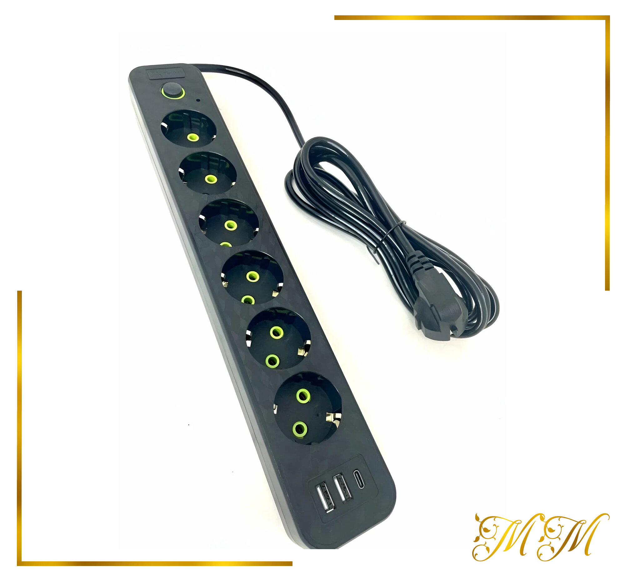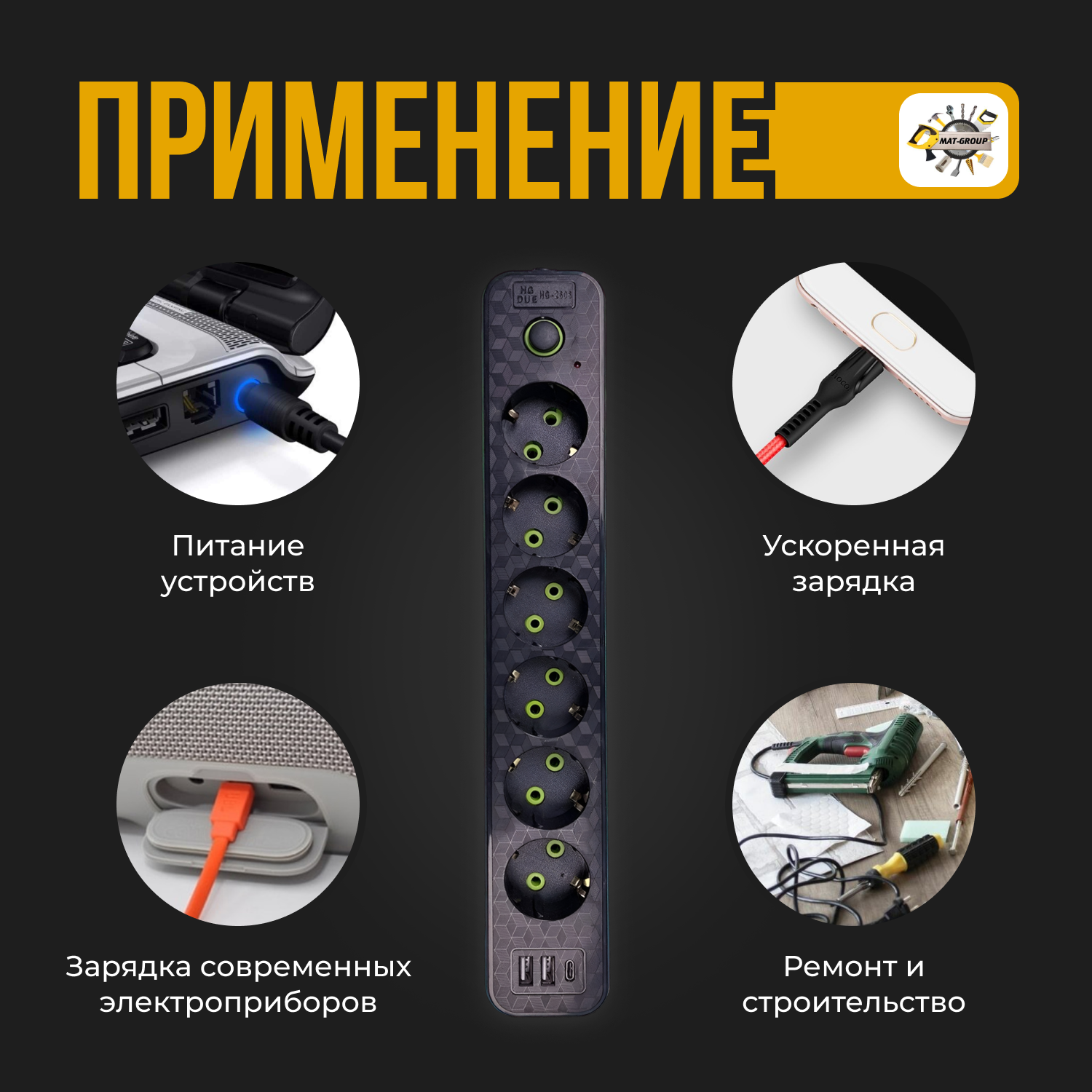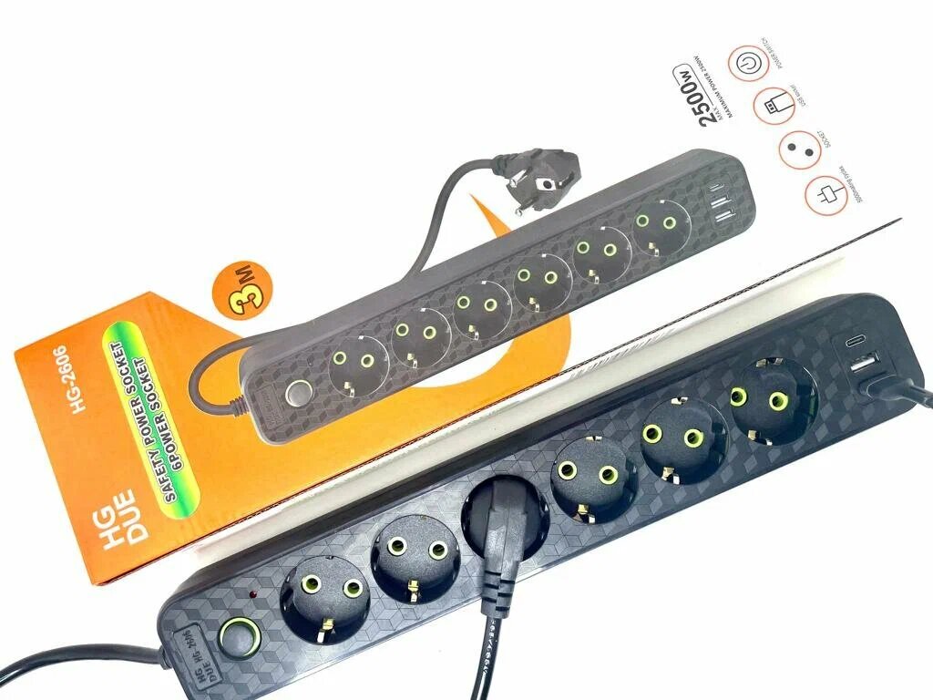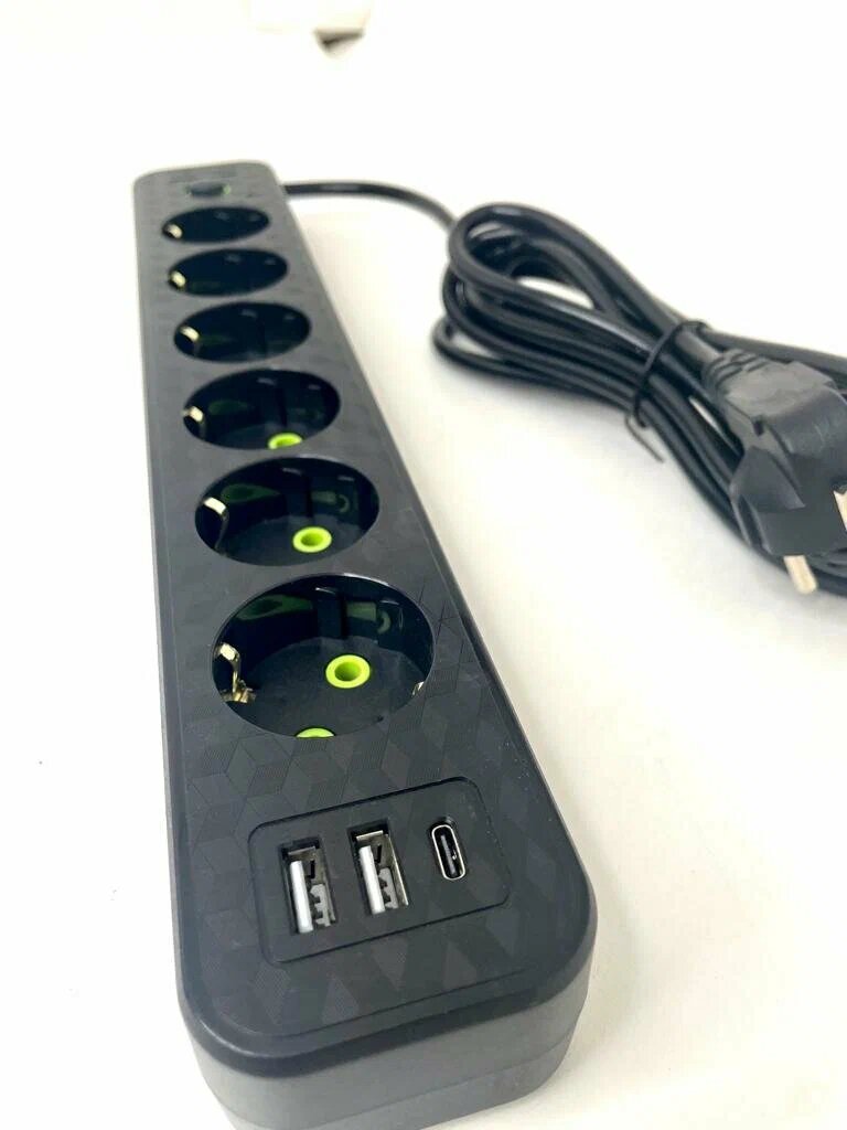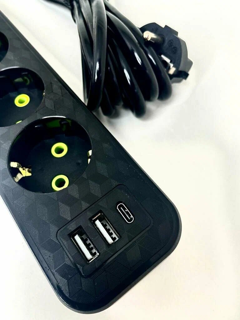 Купить Сетевой фильтр с 6 гнездами и 2 USB 1 Type-C, удлинитель бытовой 3метра 2 USB проёма, Универсальный удлинитель для дома 3 м 2 USB 1 Type-C