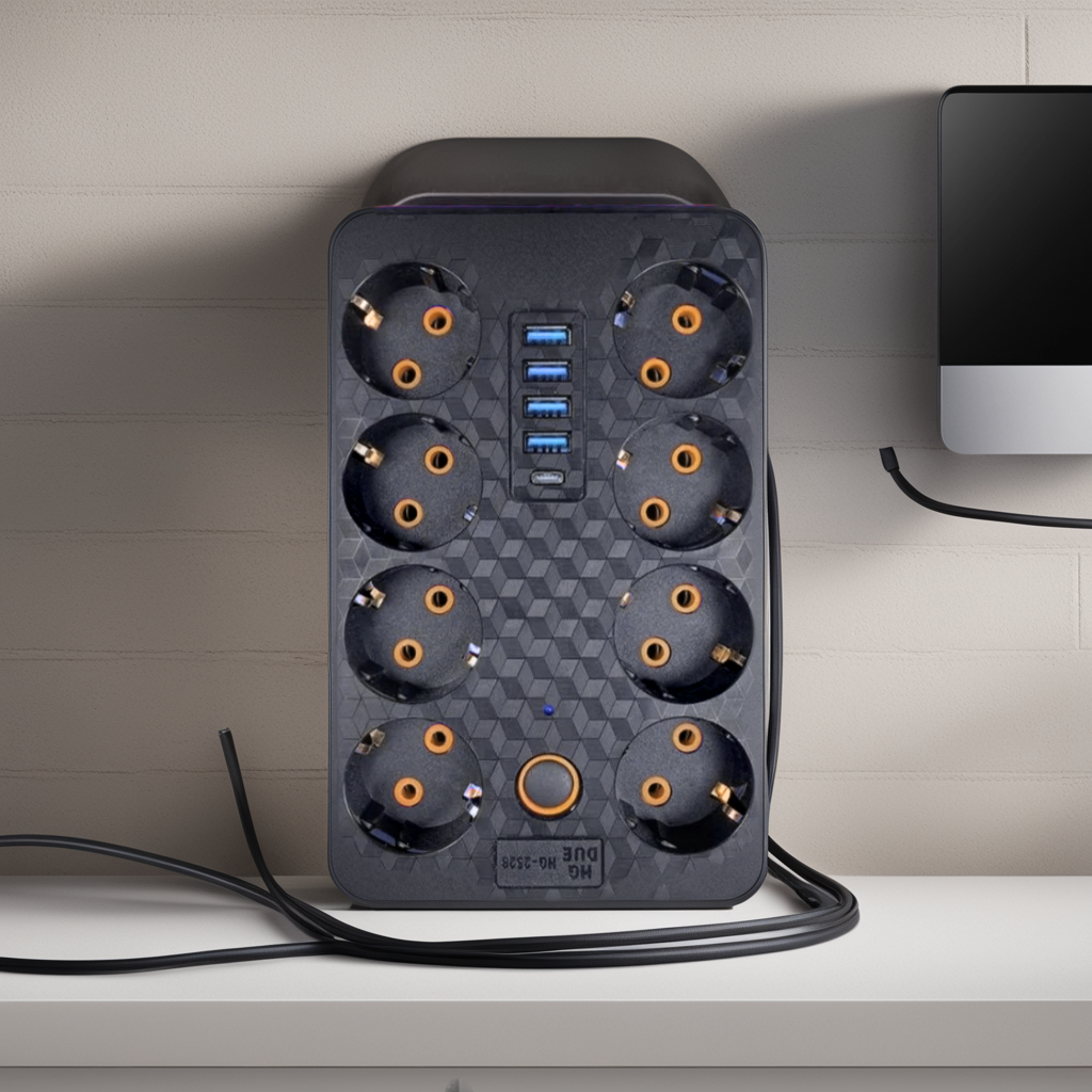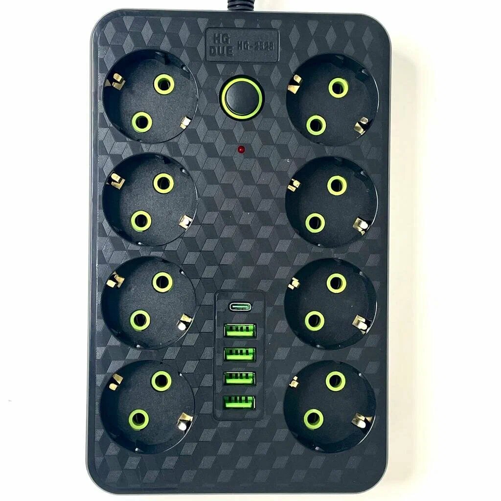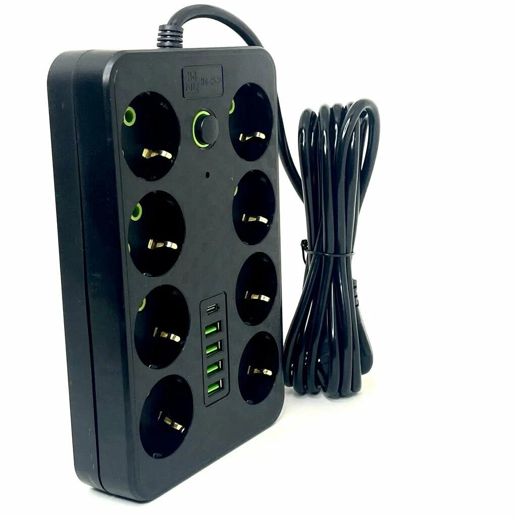 Сетевой фильтр с 8 розетками 4 USB + 1 Type-C Удлинитель с предохранителем, 3 метра