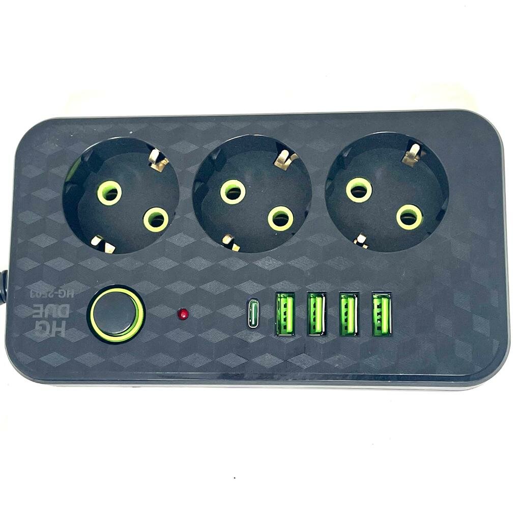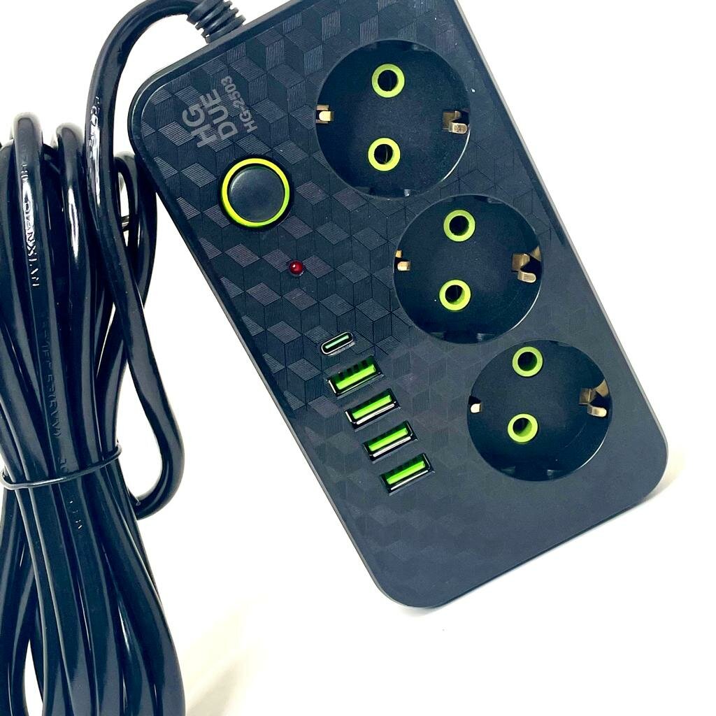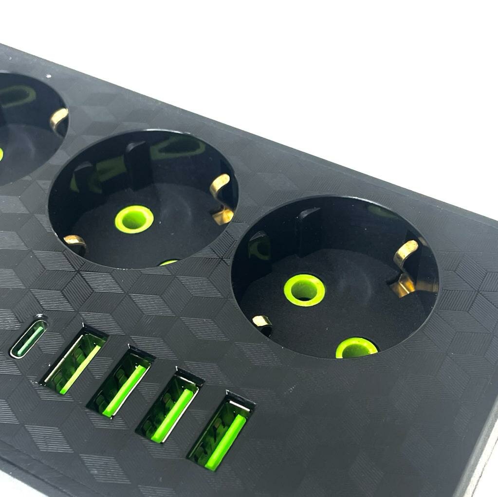 Сетевой фильтр с 6 гнездами и 2 USB 1 Type-C, удлинитель бытовой 3метра 2 USB проёма, Универсальный удлинитель для дома 3 м 2 USB 1 Type-C