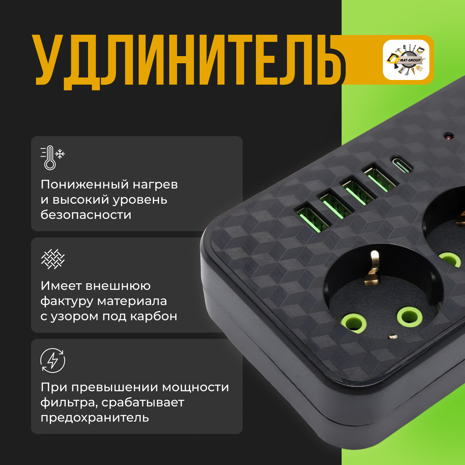 | Дополнительная информация | Сетевой фильтр с 3 гнездами и 4 USB 1 Type-C |