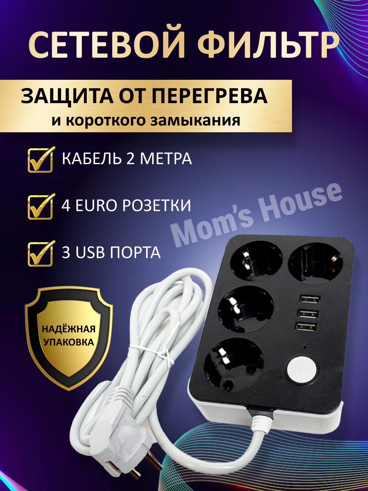 Сетевой фильтр с предохранителем с usb и защитой от напряжения кабель 2 метра 4 розетки Cиловой удлинитель квадрат интересное: