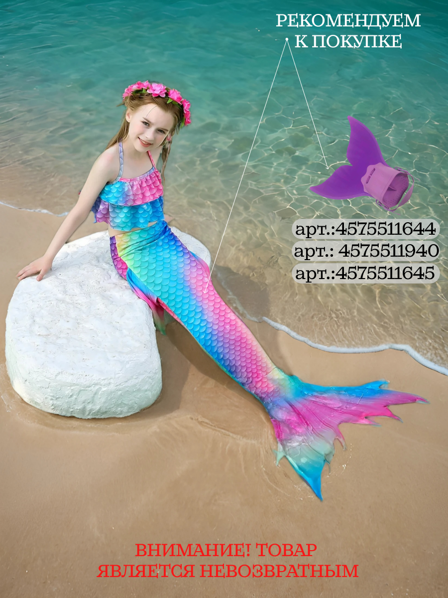 | Комплектация | раздельный купальник, хвост русалки, венок с цветами на голову, аксессуары |