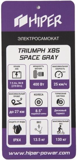 HIPER Электросамокат HIPER Triumph X85 Space Gray, колеса 8.5” шины надувные шины, 400 Вт мотор, батарея 7,5Ач(36В,270Втч), до 25кмч, cерый космос