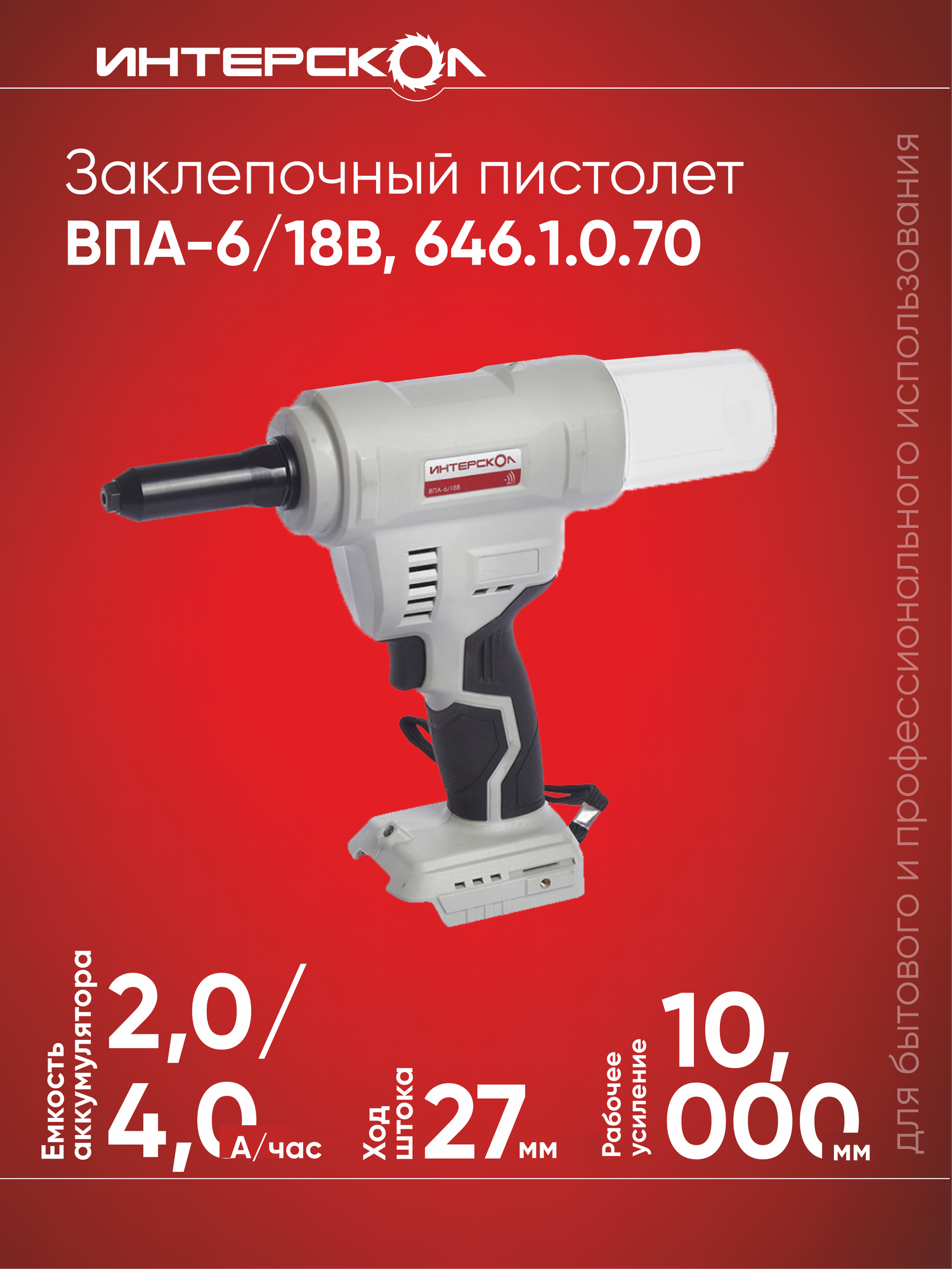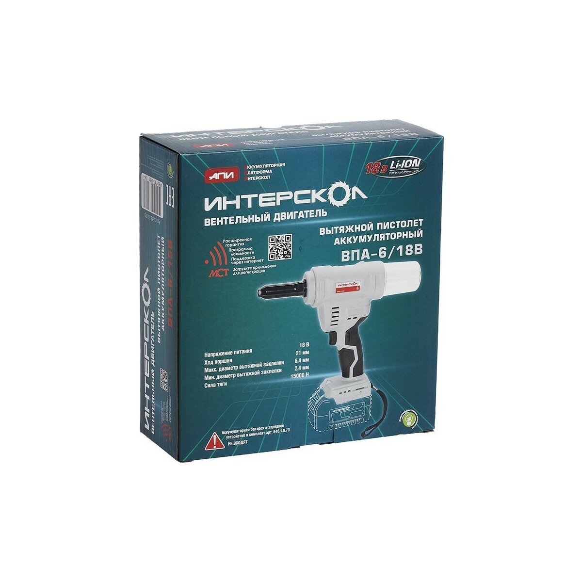 Заклепочный пистолет с бесщеточным (вентильным) двигателем ИНТЕРСКОЛ ВПА-6/18 (картон, без аккум, ЗУ) (646.1.0.70)
