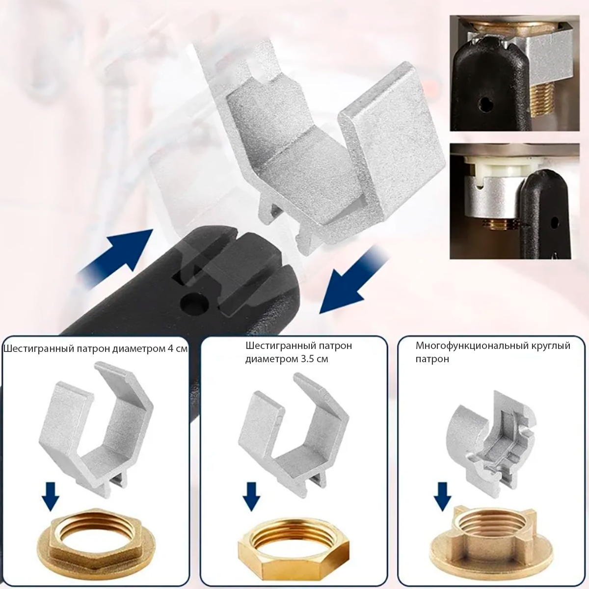 Ключ сантехнический 6 в 1 вставка 21-23-27 мм, корпус 28 и 52 мм, 250 мм