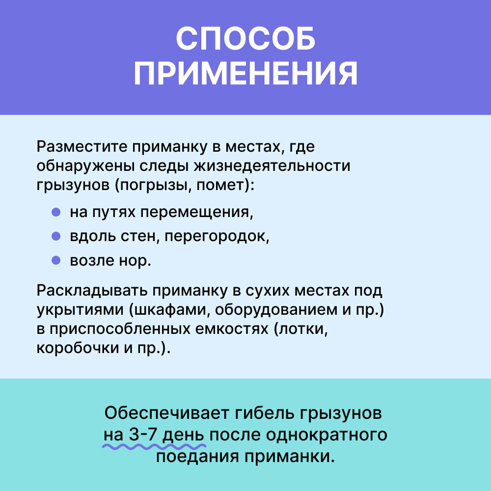 | Способ применения | Приманку разместить в местах, где обнаружены следы жизнедеятельности грызунов |
