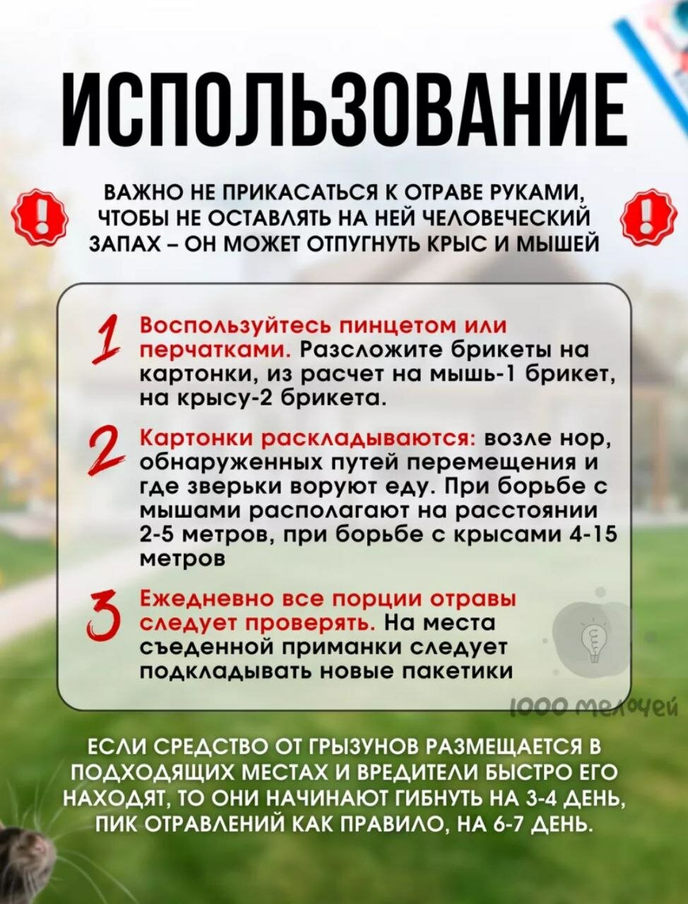 | Способ применения | наденьте резиновые перчатки, чтобы отбить запах человека при раскладывании брикетов. Извлеките приманку из пакетов. Поместите ее в специальные контейнеры (купить можно у нас) или на картонные подложки. Расставьте отраву в местах обитания грызунов: возле их нор, вдоль стен и заборов. Проверяйте приманку на поедаемость в течение недели. При необходимости перемещайте ее на другое место. Продолжайте раскладывать брикеты Крысиная смерть до полного исчезновения грызунов с объекта. Считается, что работы по дератизации можно прекратить, если приманки остаются нетронутыми в течение одной-двух недель. Трупы грызунов следует собирать и утилизировать путем сжигания или закапывания в землю на глубину 0,5 метров с использованием извести. |