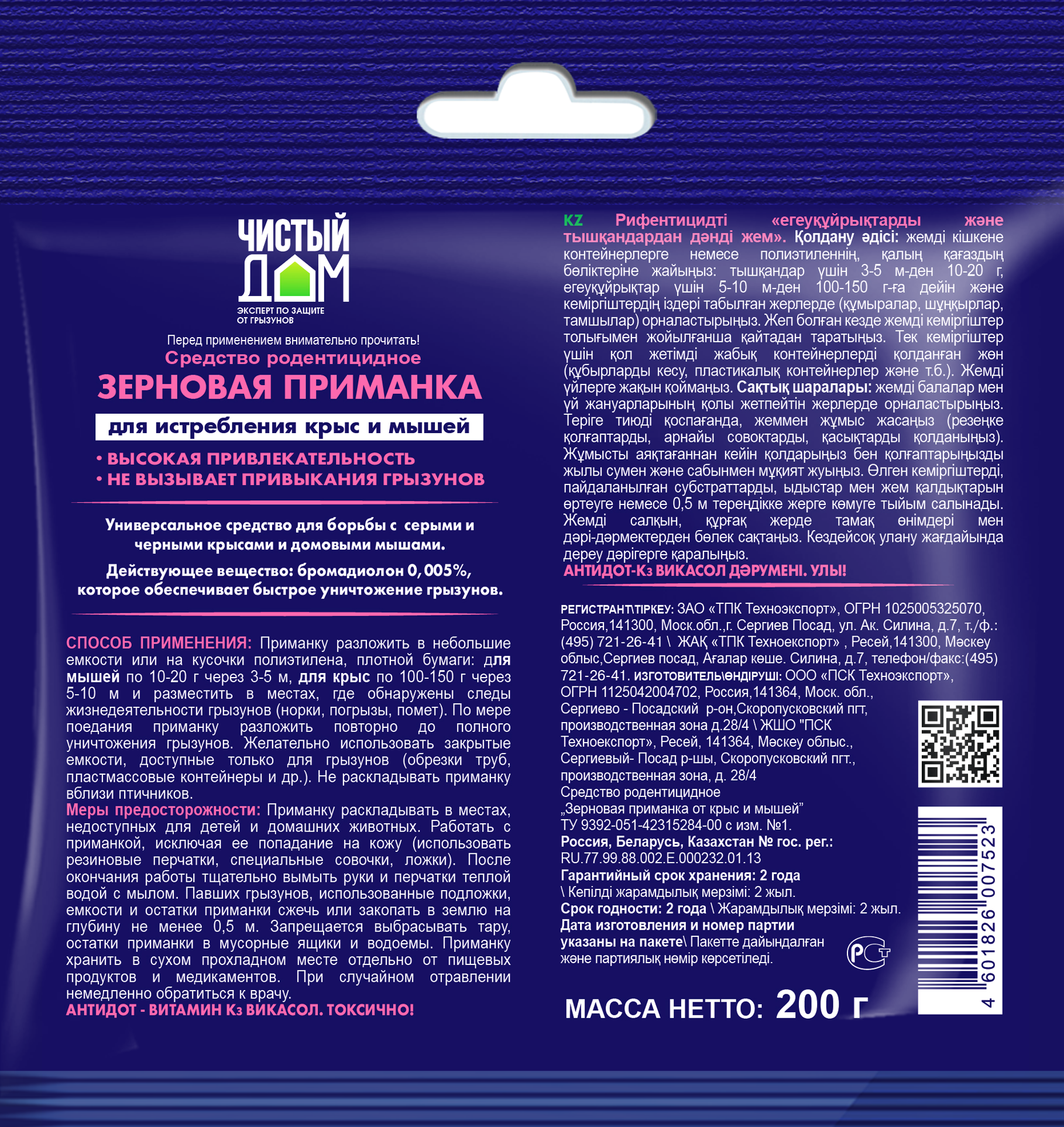 | Дополнительная информация | меры предосторожности: приманку раскладывать в местах, недоступных для детей и домашних животных; работать с приманкой, исключая ее попадание на кожу (использовать резиновые перчатки, специальные совочки, ложки); после окончания работы тщательно вымыть руки и перчатки теплой водой с мылом; павших грызунов, использованные подложки, емкости и остатки приманки сжечь или закопать в землю на глубину не менее 0,5 м; запрещается выбрасывать тару, остатки приманки в мусорные ящики и водоемы; приманку хранить в сухом прохладном месте отдельно от пищевых продуктов и медикаментов; при случайном отравлении немедленно обратиться к врачу; антидот – витамин КЗ викасол |