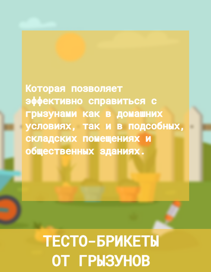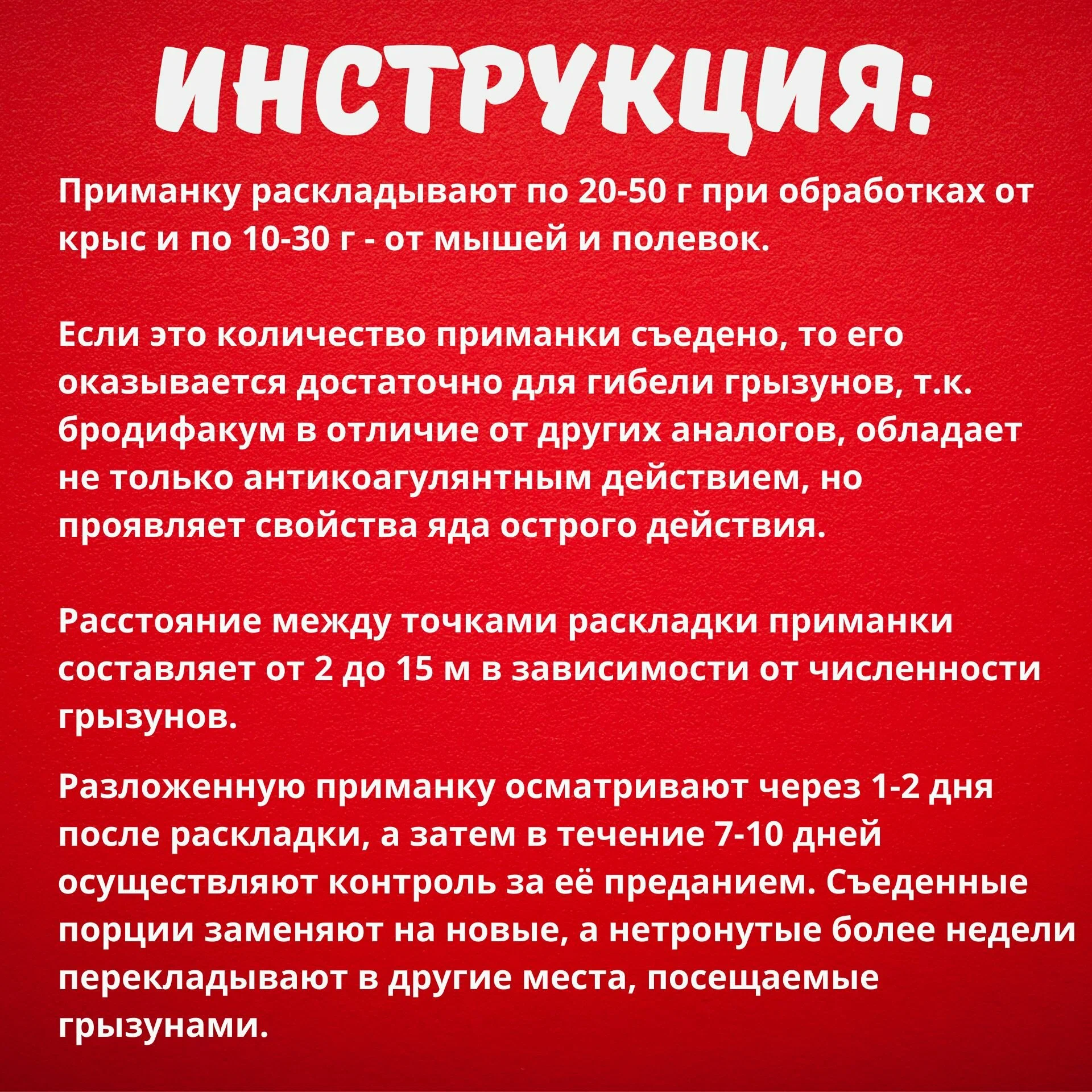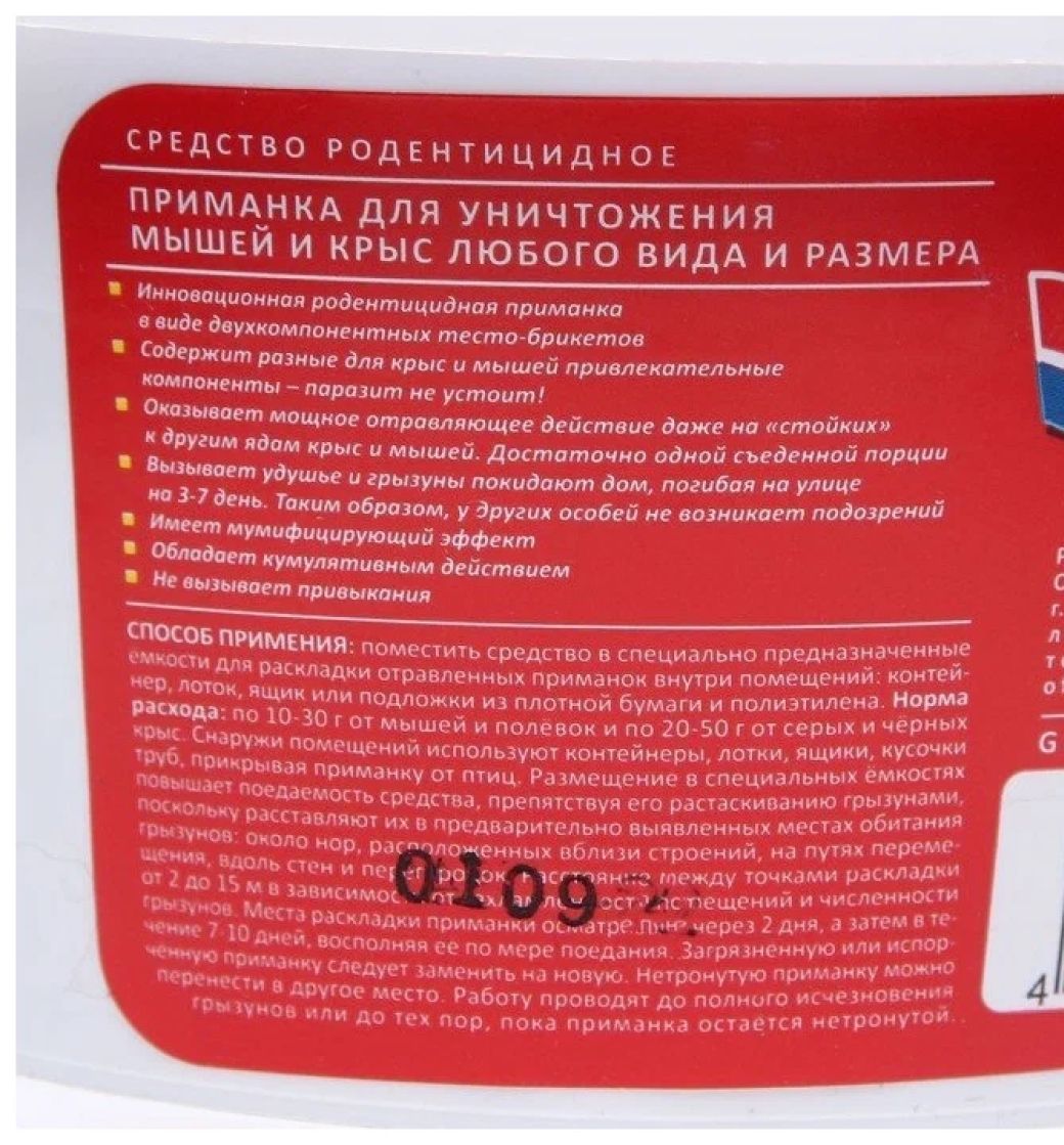 | Состав | Содержит в качестве действующего вещества (ДБ) антикоагулянт второго поколения - бродифакум- 0,005%, а также битрекс (горький компонент), предохраняющий приманки от поедания птицами и снижающий опасность случай-ного отравления людей и нецелевых видов животных, краситель, аттрактант, масло растительное, консервант и пищевые наполнители. |