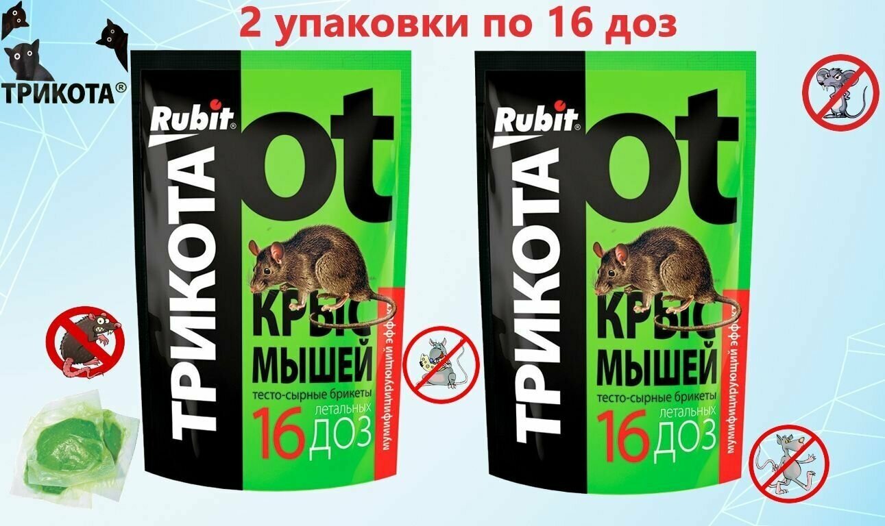 Купить Средство против грызунов крыс и мышей Rubit ТриКота тесто-сырные брикеты мумифицирующий эффект 32 дозы 2X150г