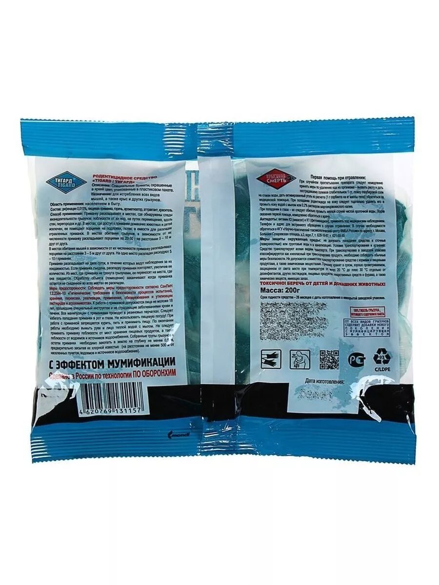 | Способ применения | приманку следует раскладывать на кусках картона, жести или полиэтилена, пинцетом или в перчатках (что бы исключить "человеческий запах") по 1 пакетику для мышей, 2-3 пакетика для крыс в местах обитания грызунов. Раскладывать через два-пятнадцать метров в зависимости от вида и численности грызунов. На протяжении семи-десяти дней контролировать поедание средства и там, где она съедена, обязательно восполнять до исходного объема. Перестать докладывать средство когда грызуны перестанут его поедать. При использовании не разрывать пакетики и не трогать голыми руками, чтобы не отпугивать грызунов человеческим запахом. Крысиная смерть не требует специальной утилизации, достаточно закопать ее или сжечь. |