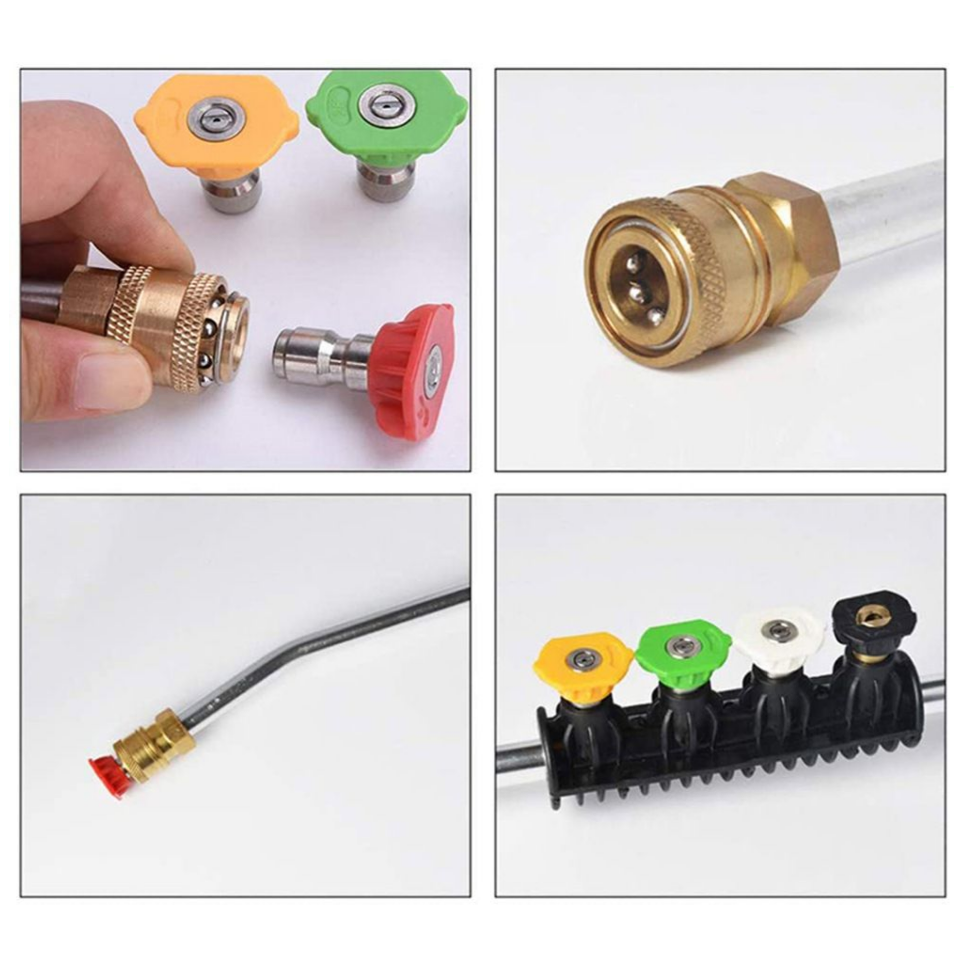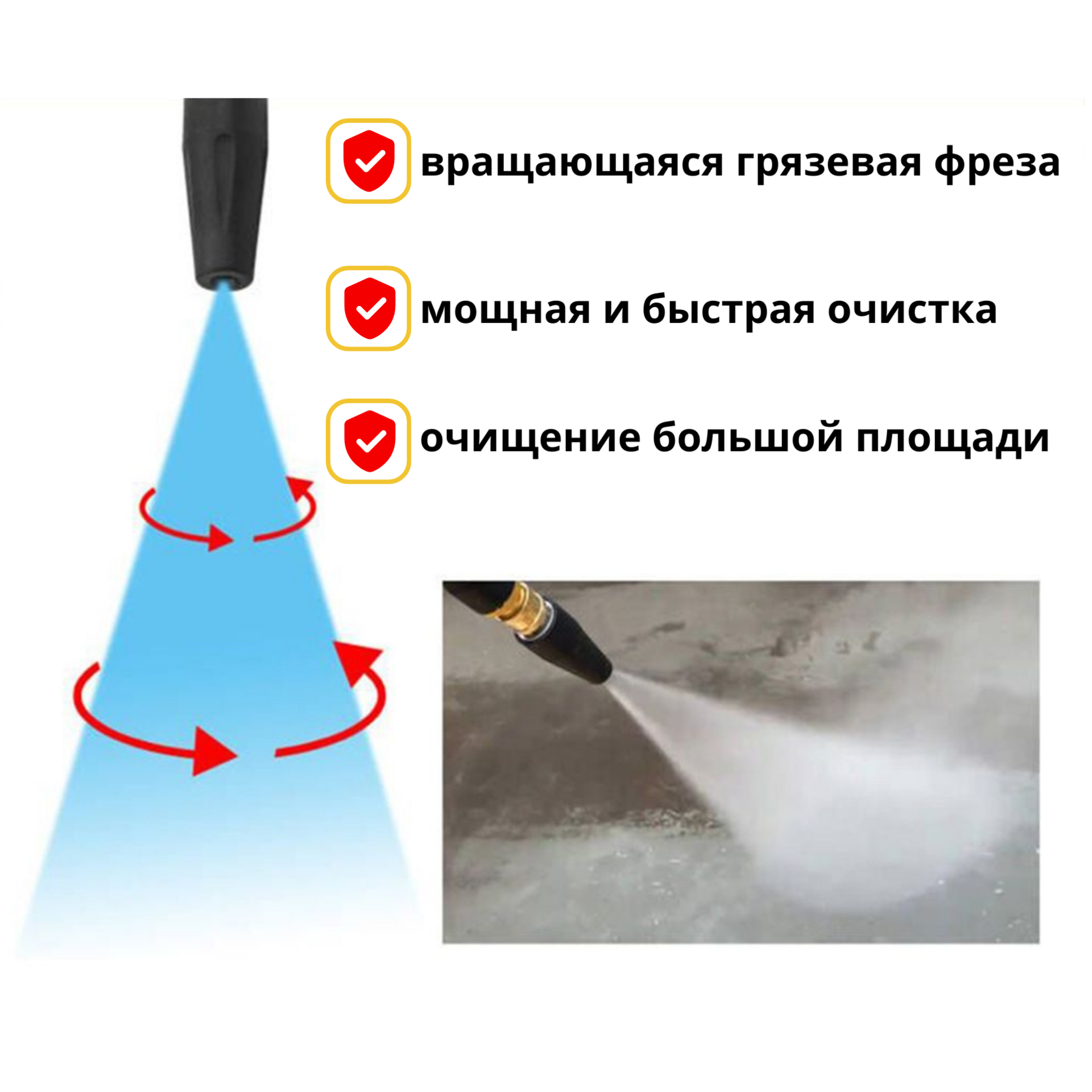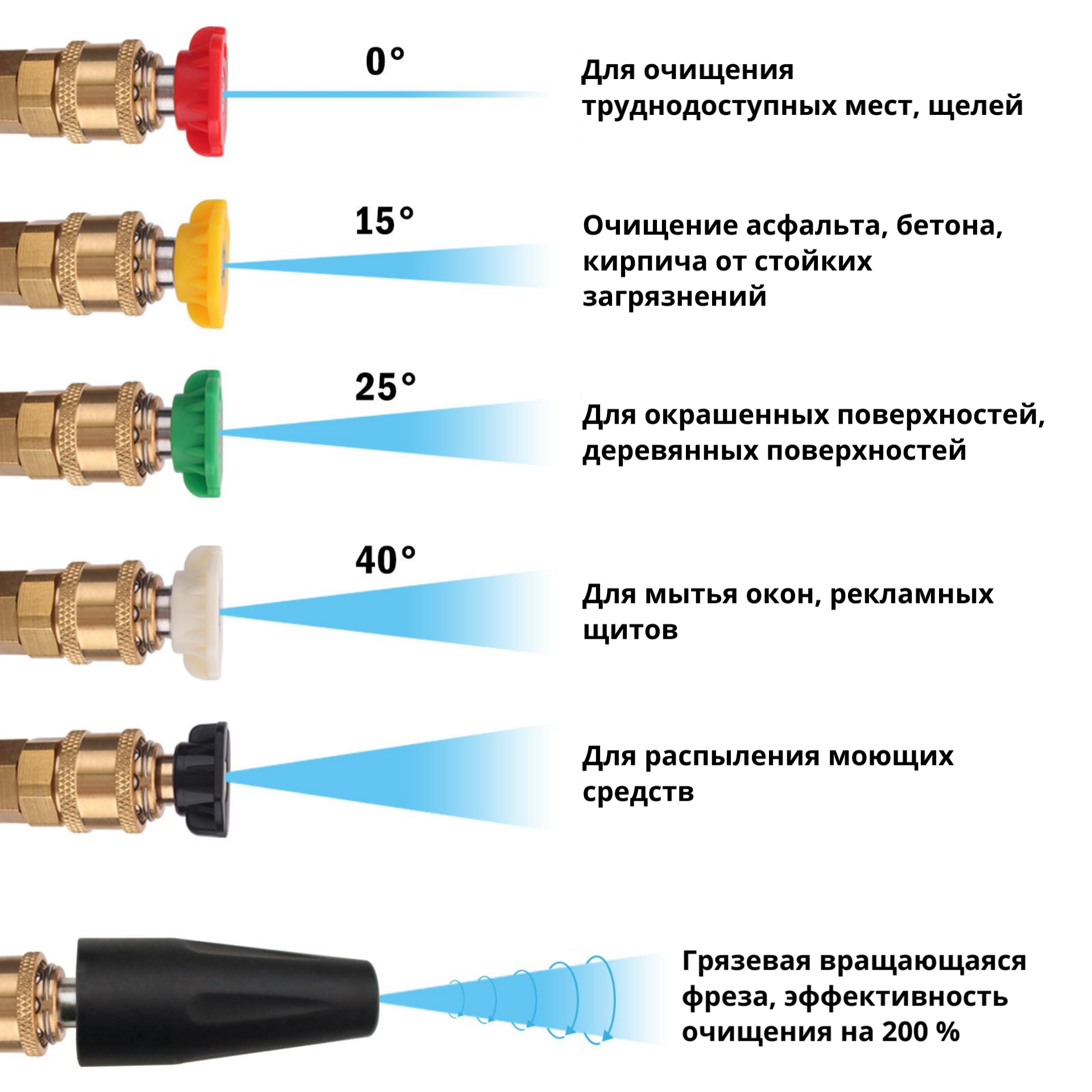 | Назначение комплекта | Угловая струйная насадка, поворотная муфта, грязевая фреза, адаптер, 5 быстросъемных насадок |