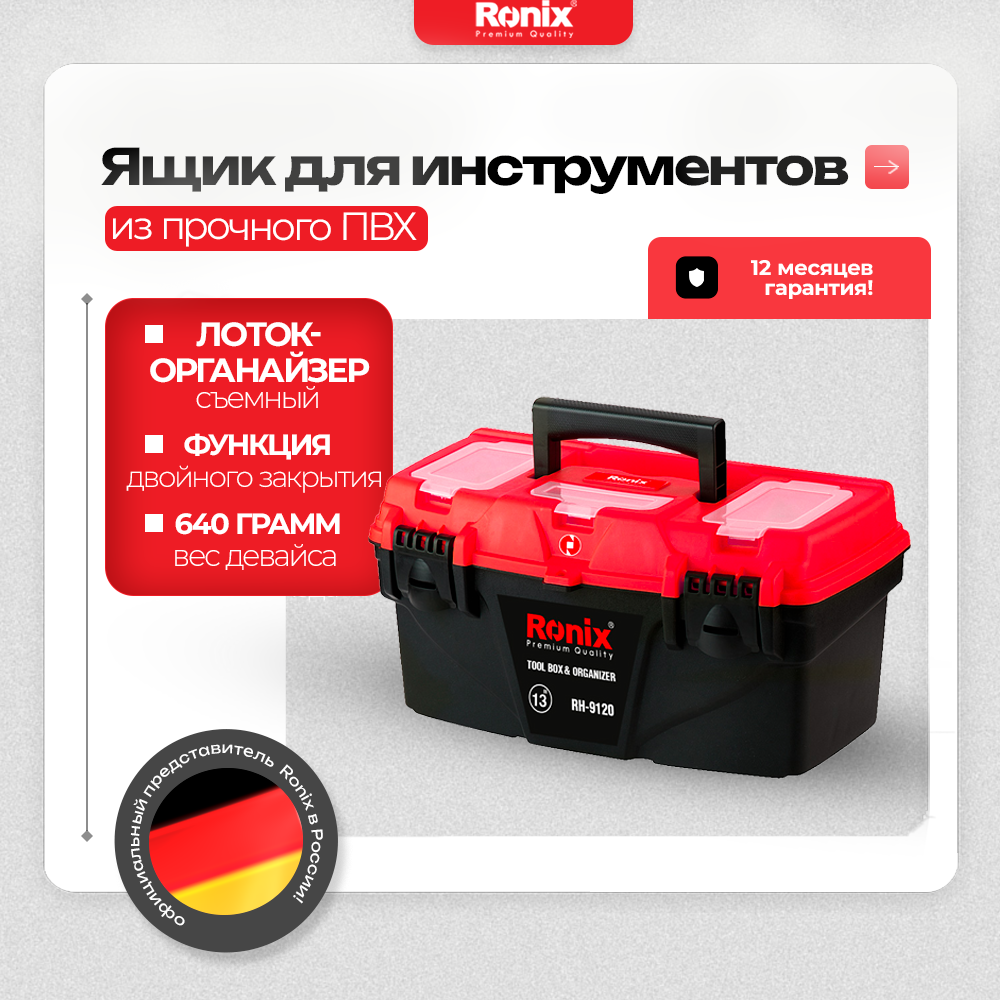 Ящик для инструментов со съемным лотком-органайзером Ronix из прочного ПВХ для хранения интересное: