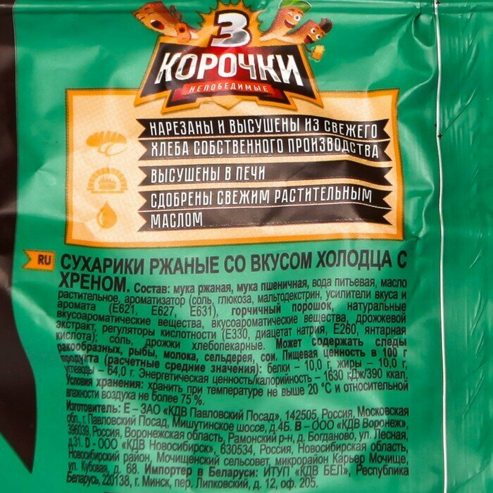 | Состав | хлеб из смеси ржаной и пшеничной муки (мука ржаная обдирная, мука пшеничная 2 сорт, вода, соль, дрожжи), масло растительное, ароматизатор «Холодец с хреном» (соль, глюкоза, мальтодекстрин, усилители вкуса и аромата (Е621, Е627, Е631), горчичный порошок, натуральные вкусоароматические вещества, вкусоароматические вещества, дрожжевой экстракт, регуляторы кислотности (кислота лимонная, Е262, Е260, янтарная кислота), жир растительный, антислеживающий агент Е551) |