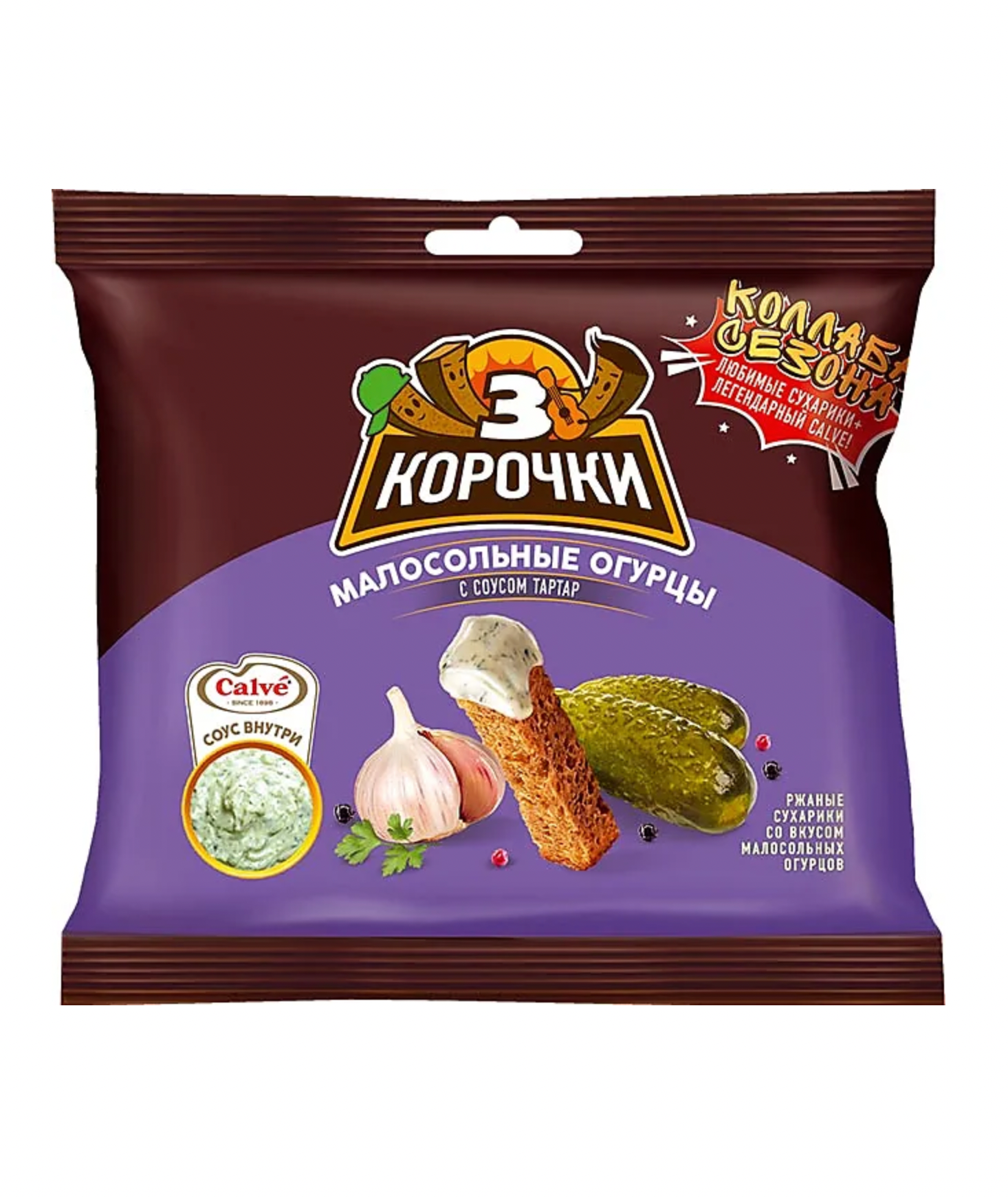 «3 Корочки», сухарики со вкусом малосольных огурчиков и соусом тар-тар «Calve», 85 г, 5 штук