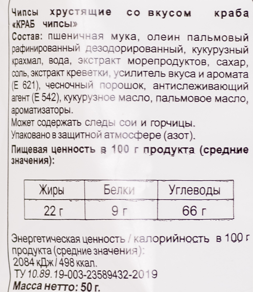 | Состав | полуфабрикат из бездрожжевого теста (пшеничная мука, кукурузный крахмал, крабовый экстракт), пальмовый олеин, специи |