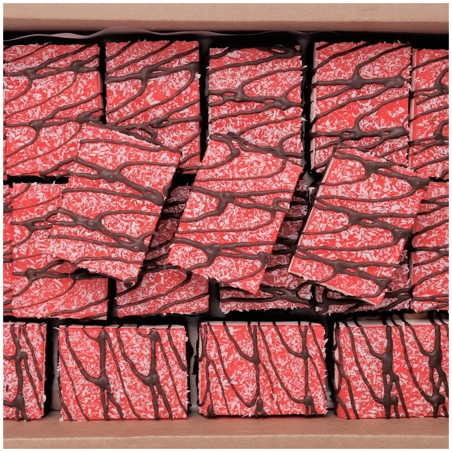 | Состав | сахар-песок, мука пшеничная хлебопекарная в/с, патока крахмальная, жир кондитерский (рафинированные, дезодорированные растительные масла, эмульгатор соевый лецитин, регулятор кислотности лимонная кислота), жир заменитель какао-масла (растительные масла, эмульгатор – соевый лецитин), какао-порошок, кокосовая стружка, агенты желирующие: агар-агар, пектин; молоко сухое обезжиренное, сухой яичный белок, регулятор кислотности – кислота молочная пищевая, ароматизаторы натуральные: шоколад, клубника; краситель натуральный – красный свекольный, консерванты: бензоат натрия, сорбат калия. |