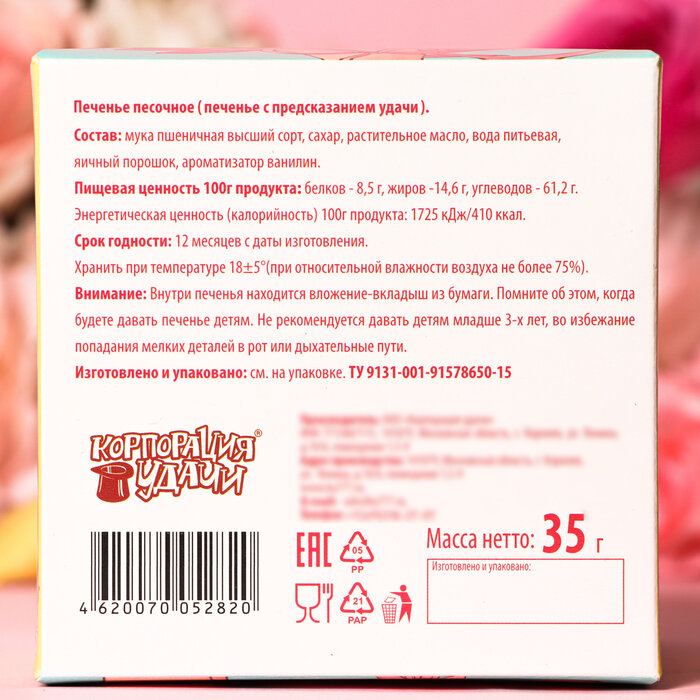 Печенье с предсказаниями "Цветы" 5 штук, 35 гр, Корпорация Удачи, Подарок