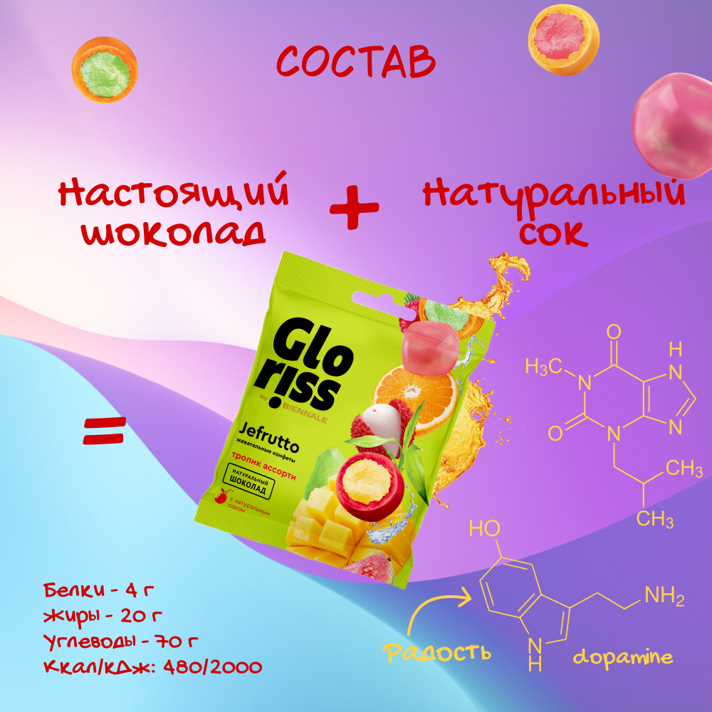 Жевательные конфеты Gloriss BIENNALE " Jefrutto" в шоколаде со вкусом манго-малина 75 г