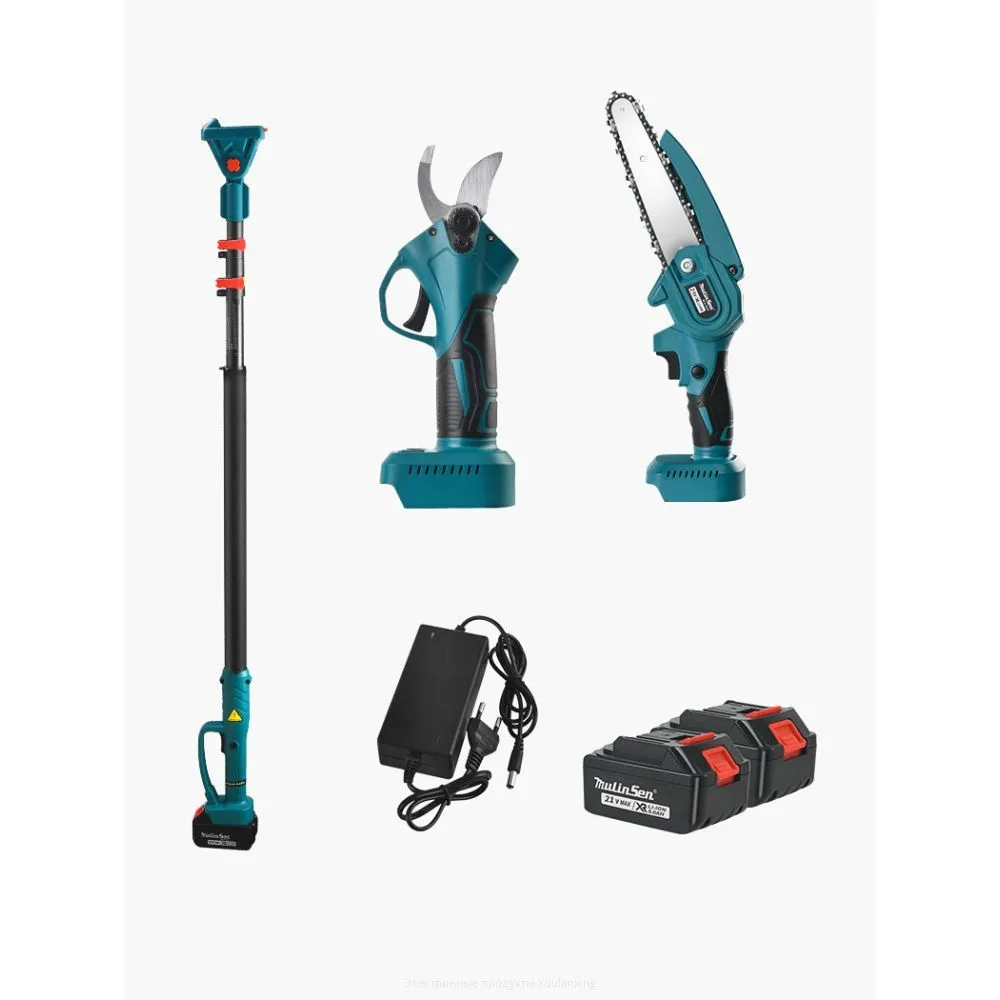 Купить Набор садовых инструментов. Электро пила + электрический секатор для обрезки, с телескопической штангой(удлинитель) длиной 2.5 м, 2 акб