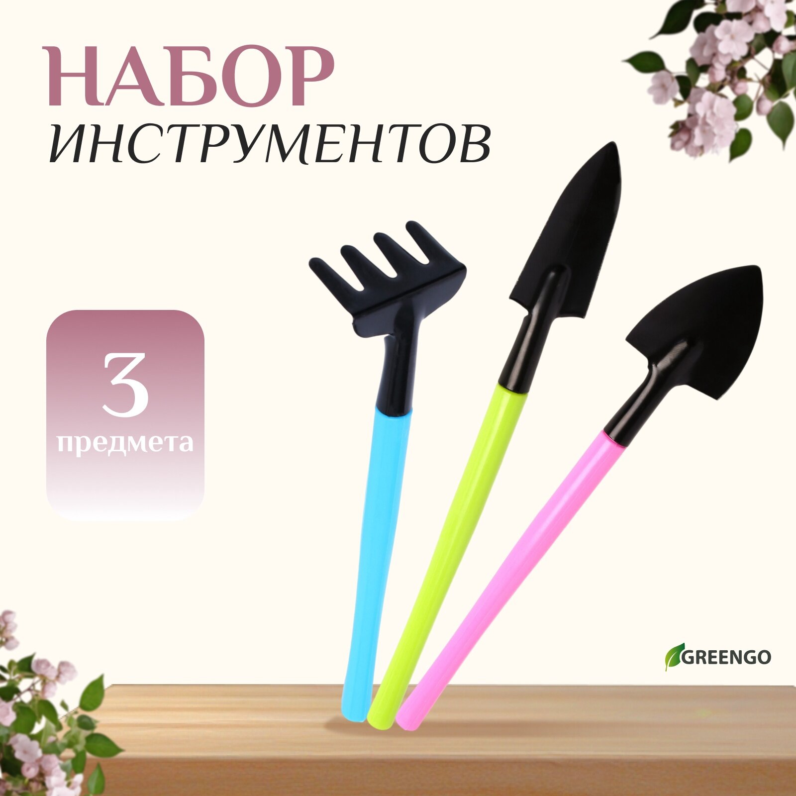Набор садового инструмента, 3 предмета: грабли, 2 лопатки, длина 21 см, пластиковые ручки