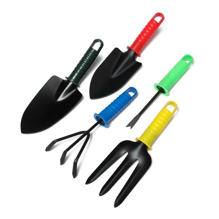 Купить Набор садового инструмента, 5 предметов: 2 совка, рыхлитель, вилка, корнеудалитель, длина 27 см, пластиковые ручки, цвет микс