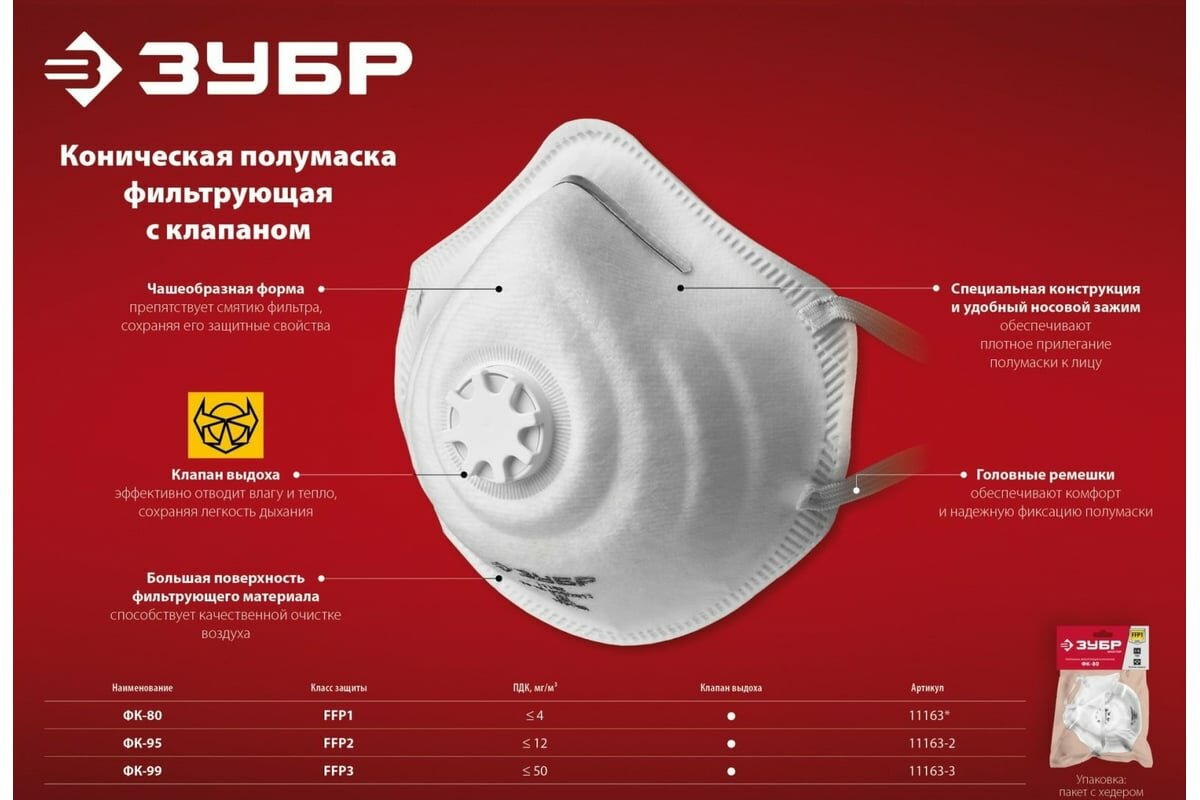 Коническая фильтрующая полумаска с клапаном ЗУБР ФК-95 FFP2 11163-2_z01 интересное: