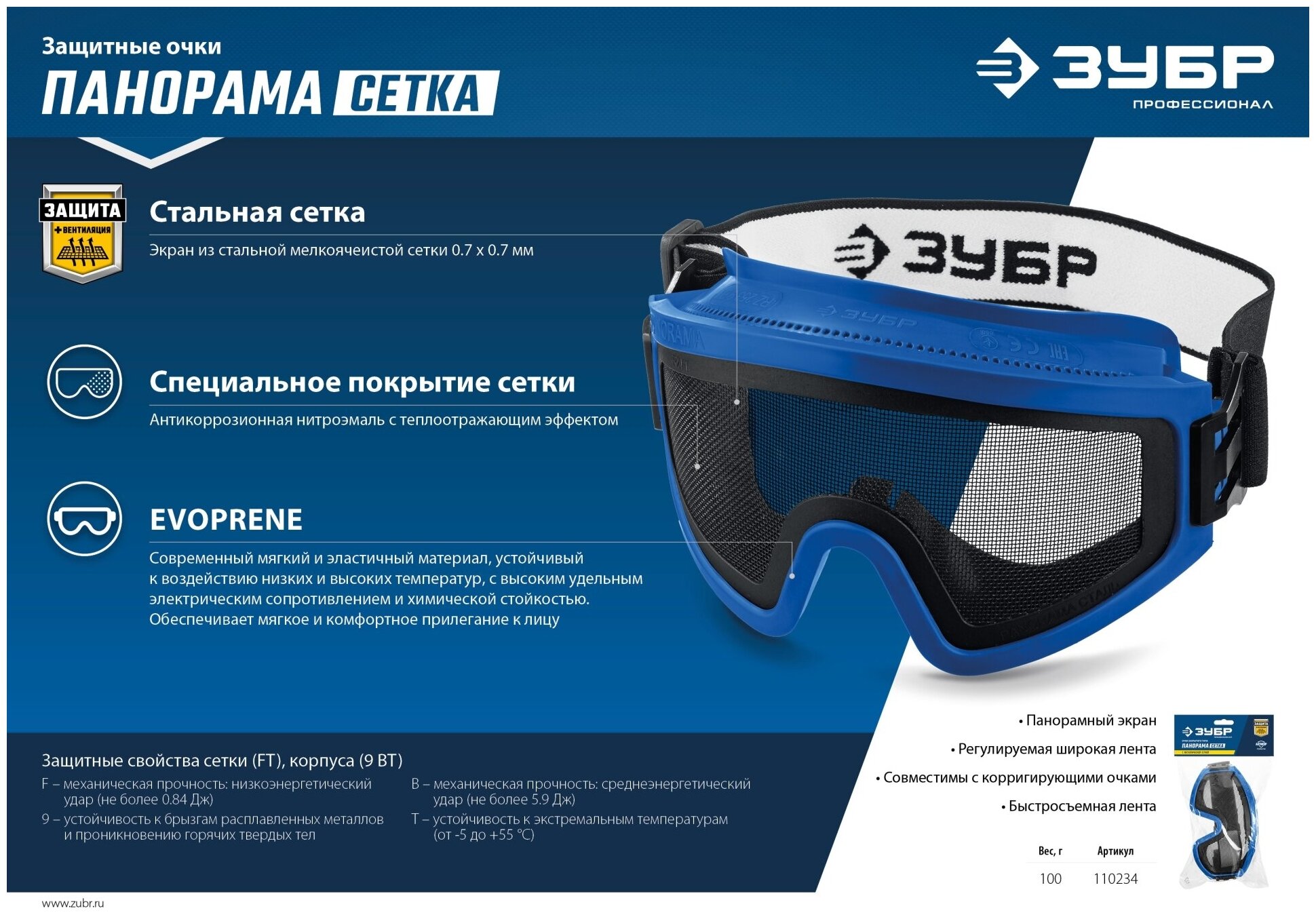 ЗУБР панорама сетка, закрытого типа, экран из стальной мелкоячеистой сетки, защитные очки, Профессионал (110234)