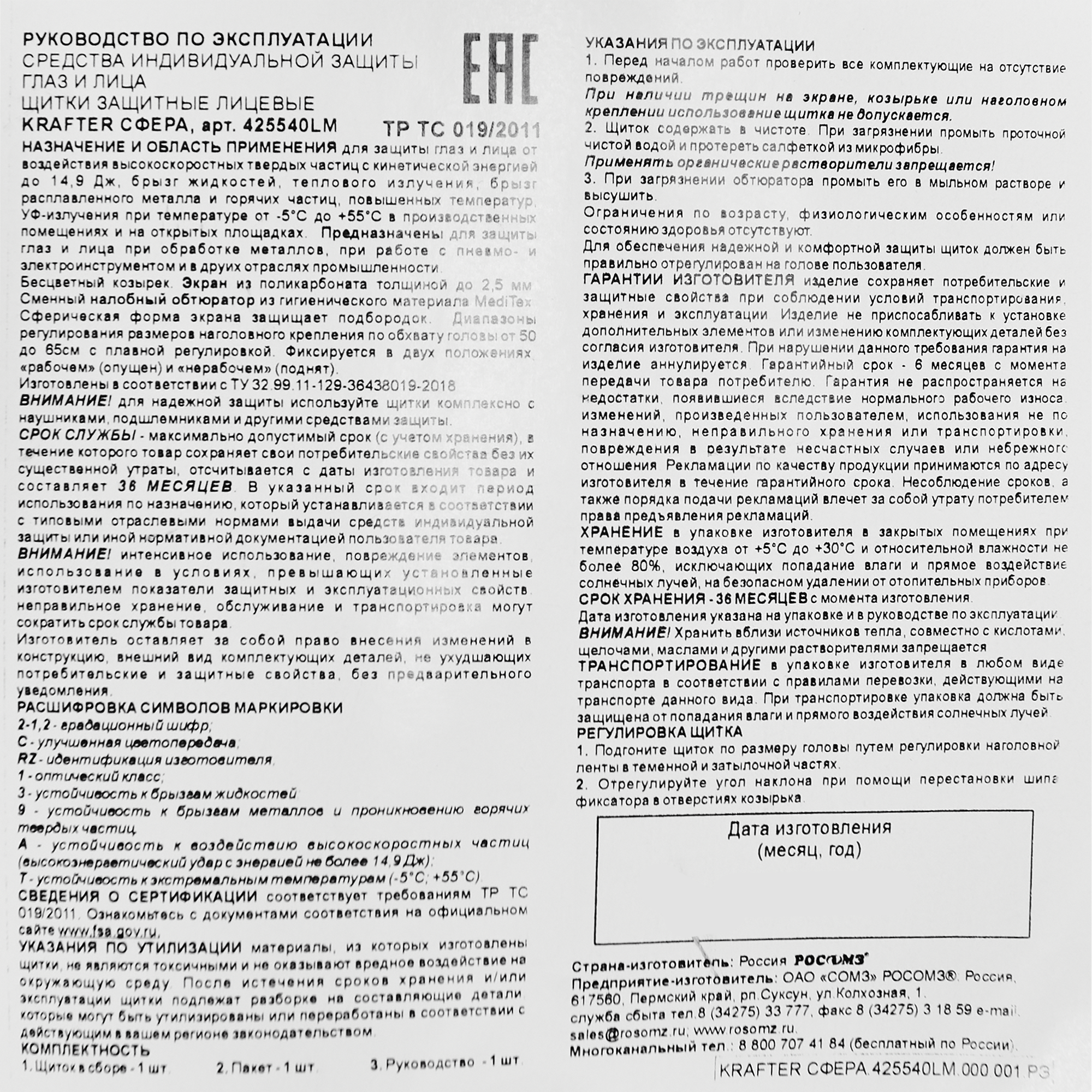 | Дополнительная информация | Щиток защитный сфера Krafter, поликарбонат |