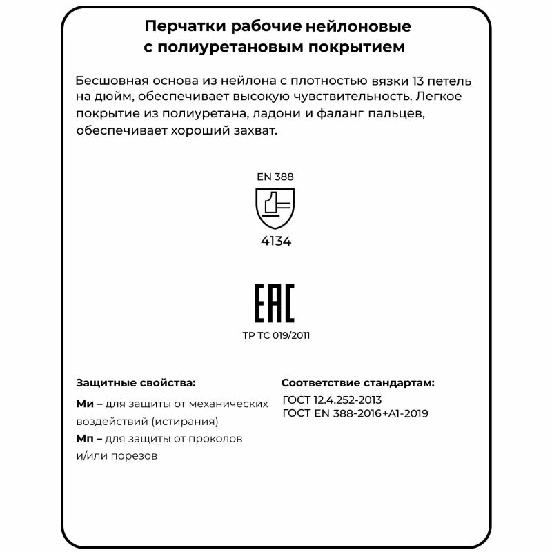 Перчатки защитные нейлоновые с полиуретановым покрытием, размер 8 (M), 12 пар