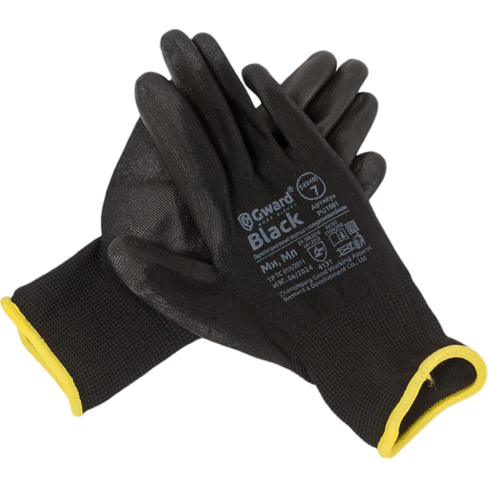 Перчатки нейлоновые с полиуретановым покрытием, рабочие, хозяйственные Gward Black PU1001 черного цвета, размер 7 (S), 12 пар
