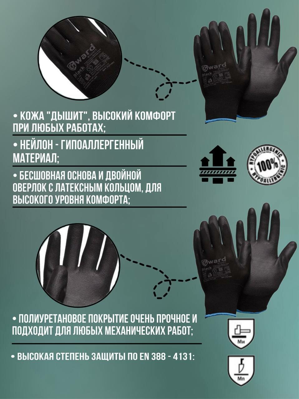 Перчатки нейлоновые с полиуретановым покрытием, рабочие, хозяйственные Gward Black PU1001 черного цвета, размер 9 (L), 12 пар