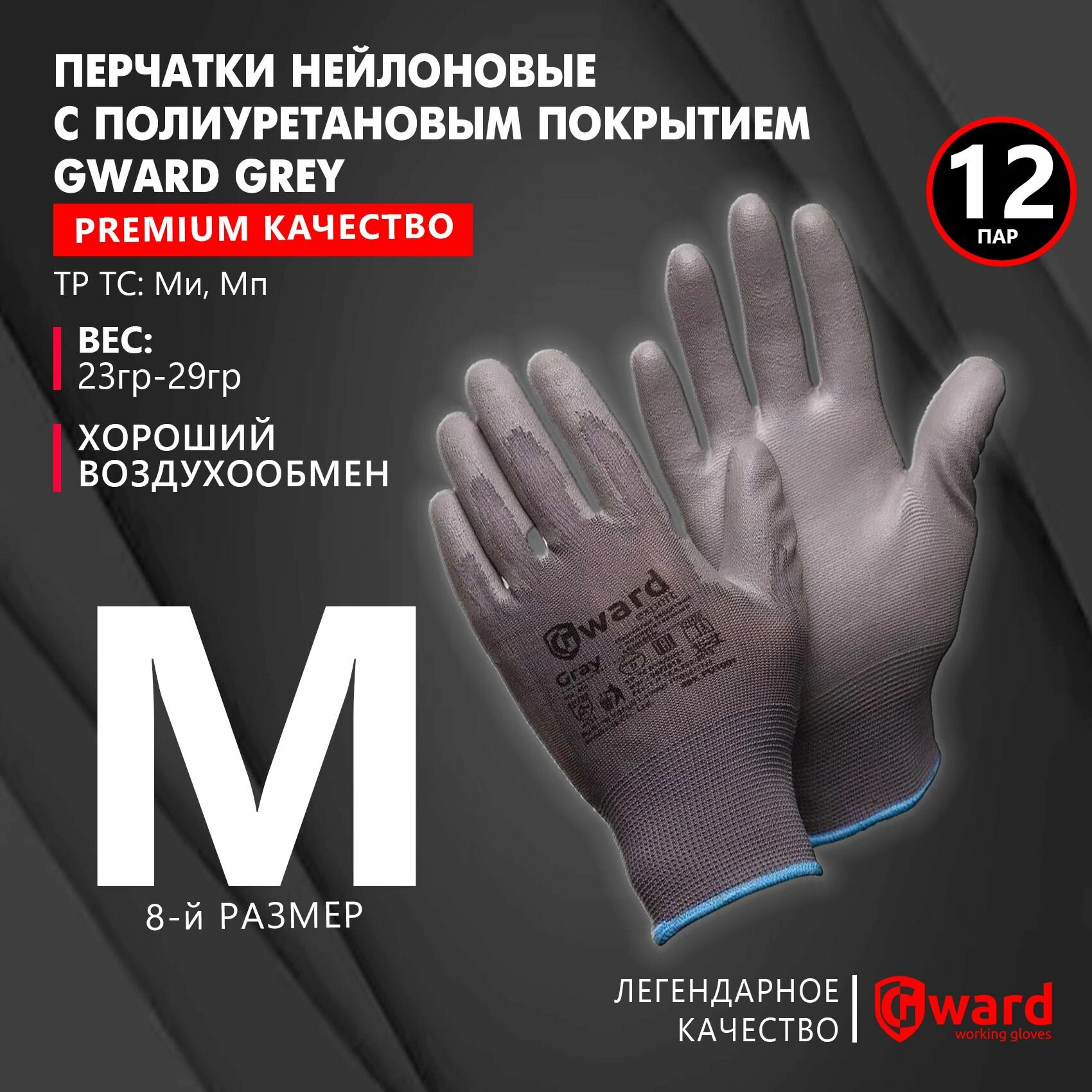 Купить Перчатки нейлоновые с полиуретановым покрытием, рабочие, хозяйственные Gward Grey PU1001 серого цвета, размер 8 (М), 12 пар
