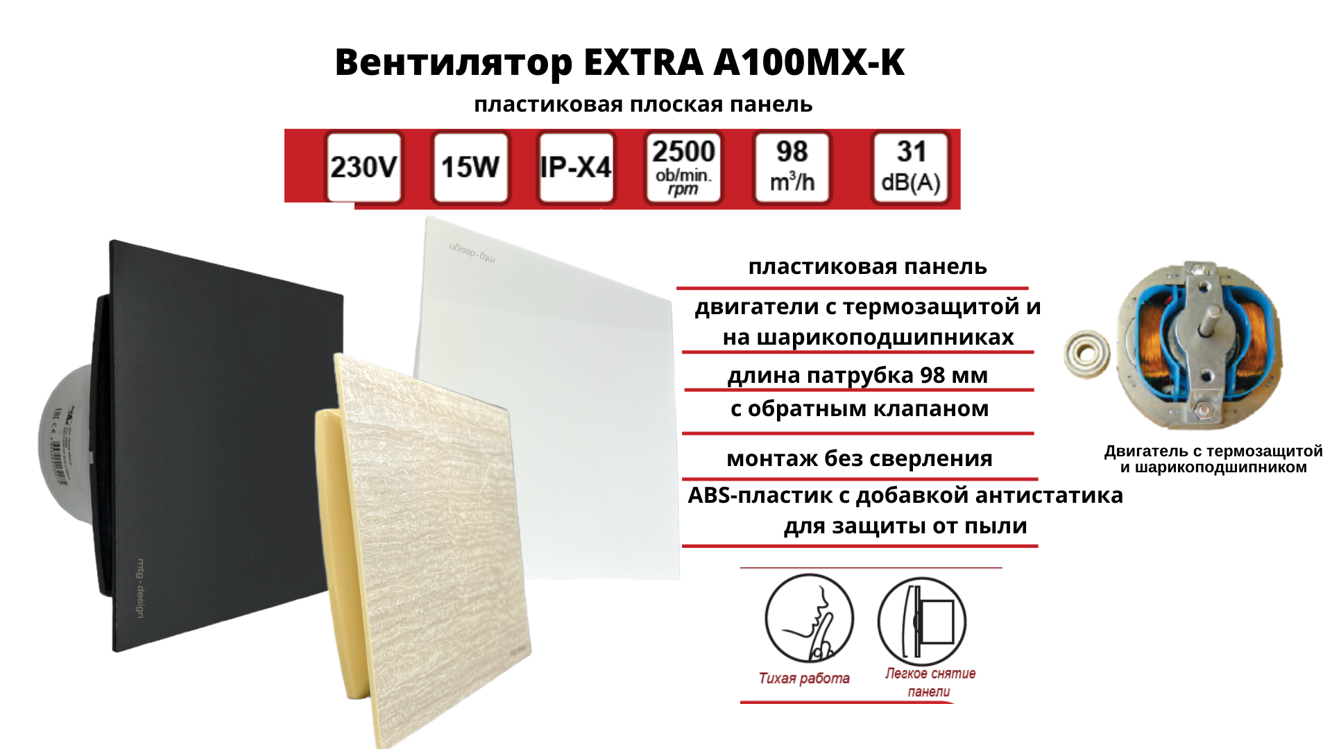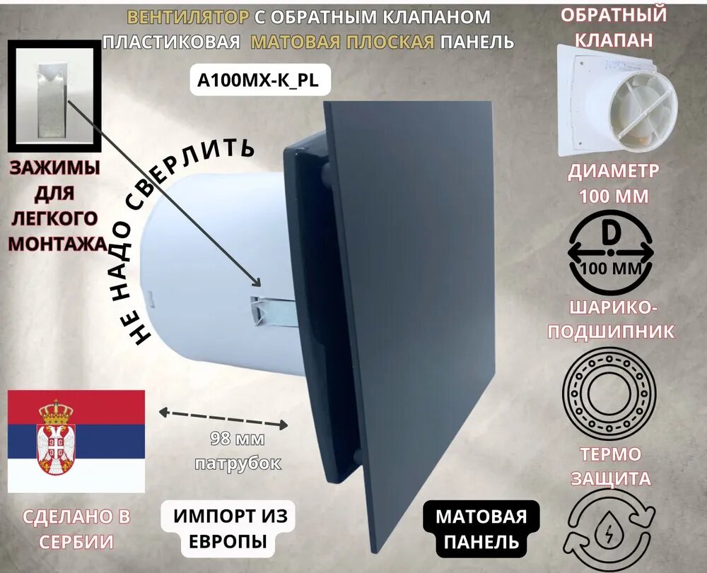 Вентилятор D100мм с плоской пластиковой панелью цвета антрацит, с обратным клапаном и креплением без сверления A100МX-PL, Сербия интересное: