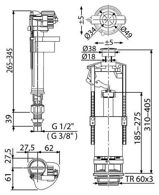 Арматура для унитаза Alcaplast SA2000SK нижняя подводка (металл), стоп кнопка