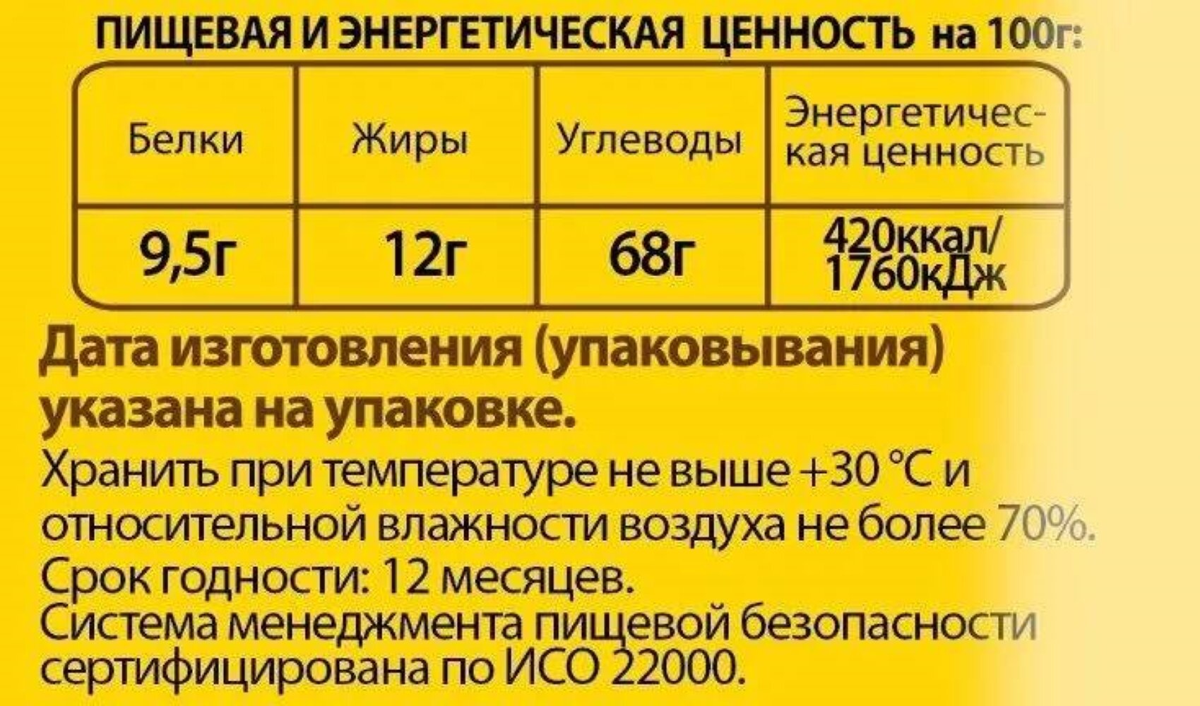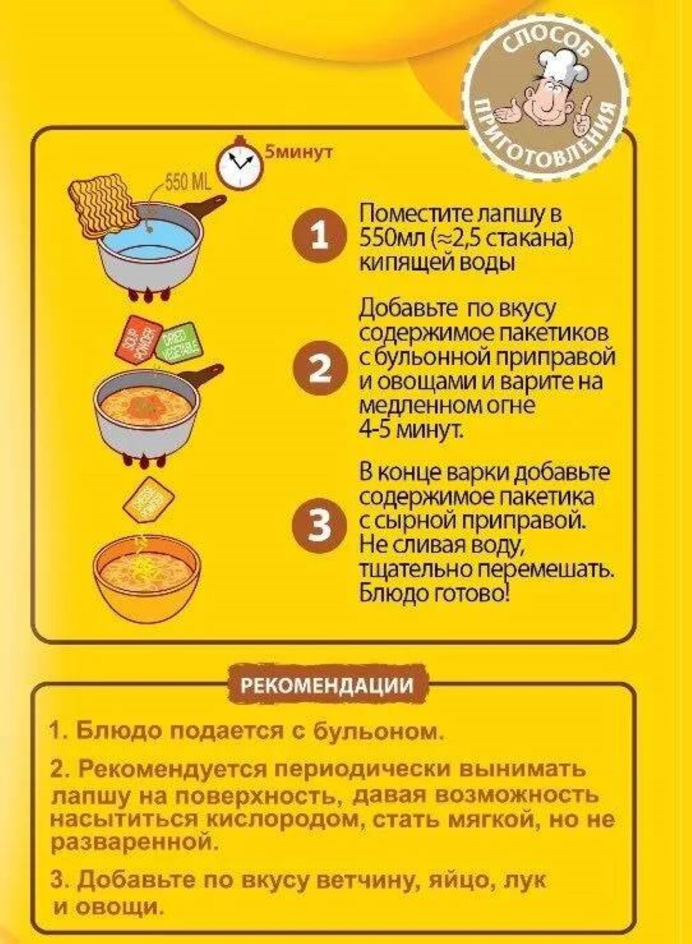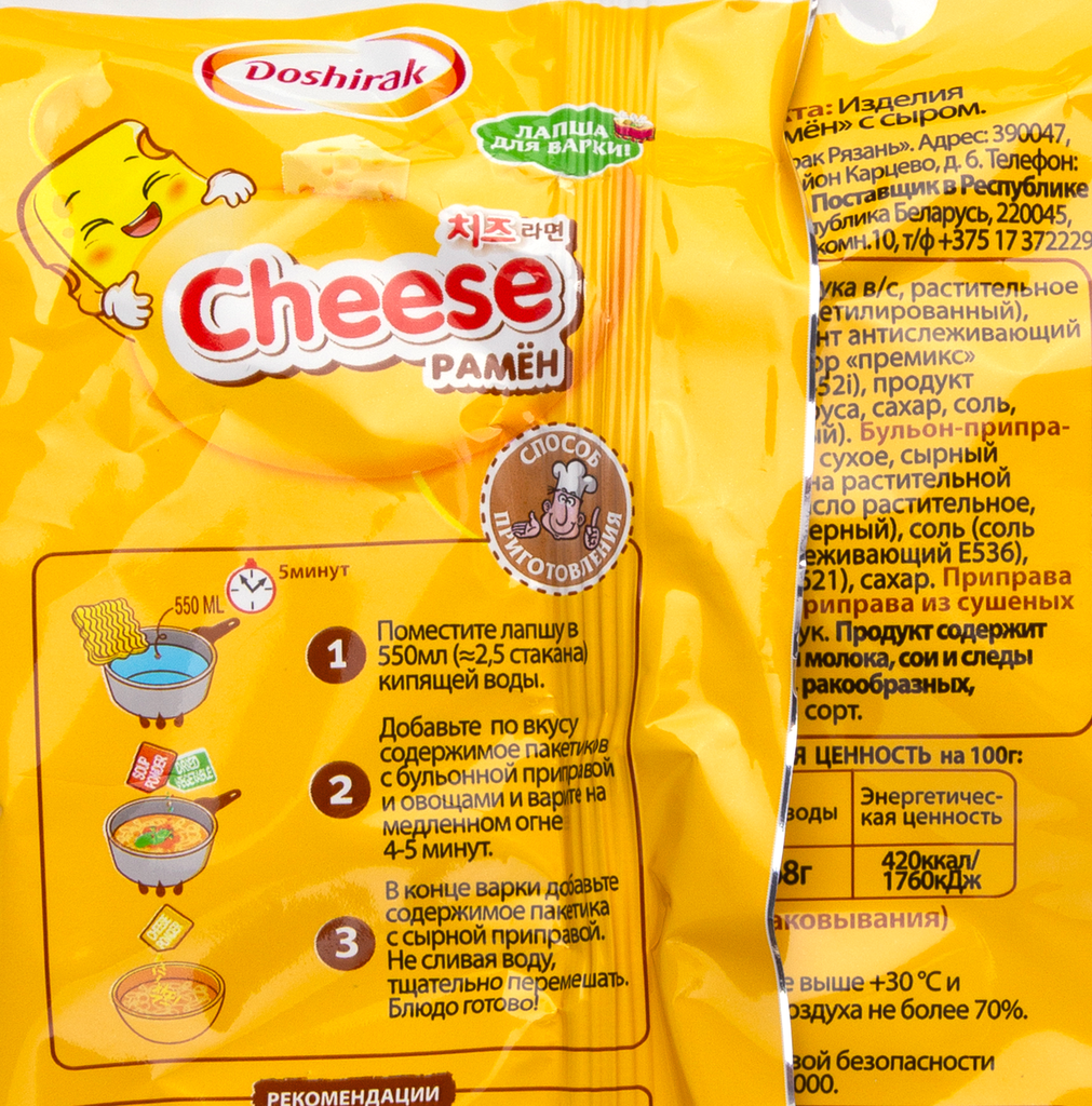 | Состав | Лапша: пшеничная мука в/с, растительное масло. пищевая добавка загуститель (крахмал ацетилированный), соль, клейковина, комплексная пищевая добавка эмульгатор «К-300А» (соевое масло, эмульгатор Е322), комплексная пищевая добавка стабилизатор «премикс» (стабилизаторы: Е501i, Е412, Е452i), приправы смешанные (сахар, экстракт дрожжей, растительный протеин, лук, порошок соевого соуса). Бульон-приправа: бульонная основа (молоко сухое, сырный порошок, заменитель сливок на растительной основе (кукурузный сироп, масло растительное, белок растительный), ароматизатор «сыр», перец черный), соль, усилитель вкуса и аромата (Е621), сахар. Приправа сырная: сырный порошок, ароматизатор «сыр». |