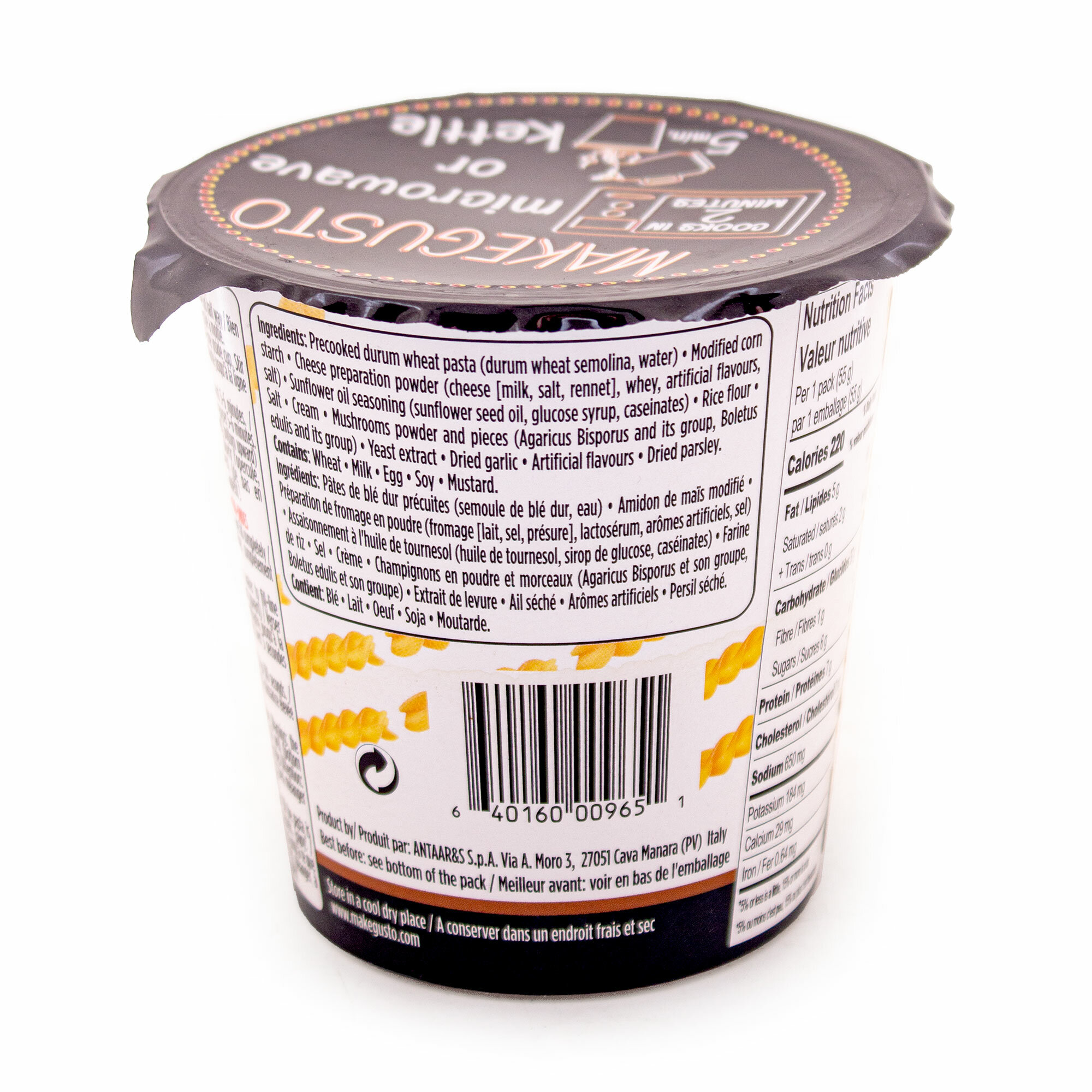 | Состав | Подготовленная паста из твердых сортов пшеницы (мука из твердых сортов пшеница, вода), модифицированный кукурузный крахмал, подготовленный сырный порошок (сыр (молоко, соль, сычужный фермент), сыворотка, ароматизаторы, соль), приправа на основе подсолнечного масла (масло из семян подсолнечника, сироп глюкозы, казеинаты), рисовая мука, соль, сливки, грибной порошок и кусочки грибов (шампиньоны, подосиновики), дрожжевой экстракт, чеснок сушеный, ароматизаторы, петрушка сушеная. Содержит пшеницу, молоко, яйца, сою, горчицу. |