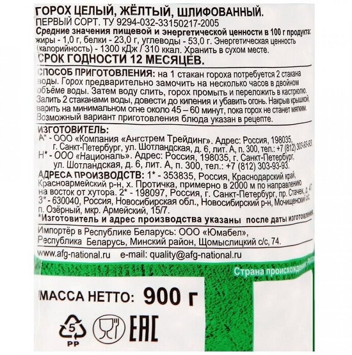 | Состав | Горох целый, желтый, шлифованный; Первый сорт; Возможно наличие следов глютена |