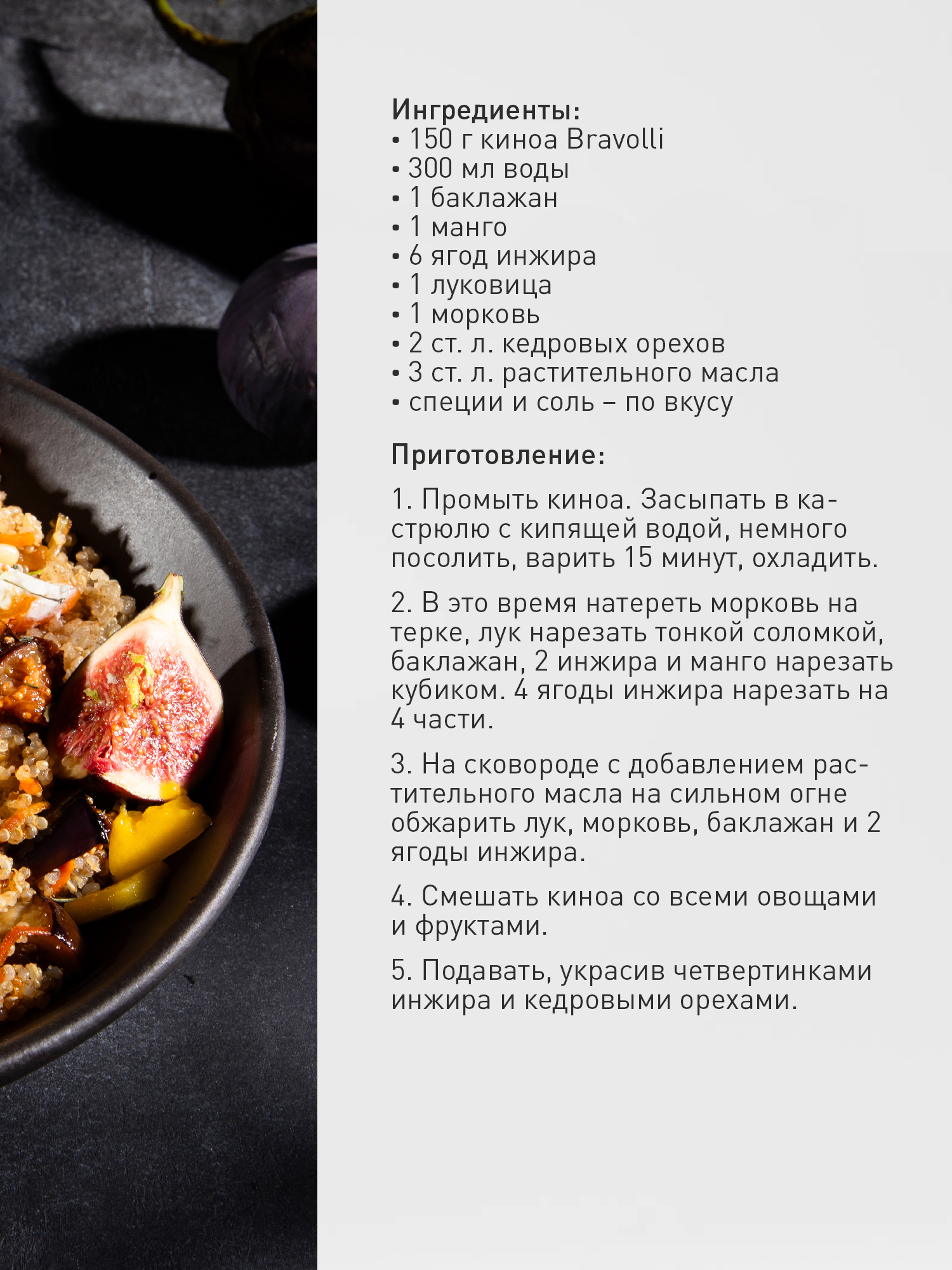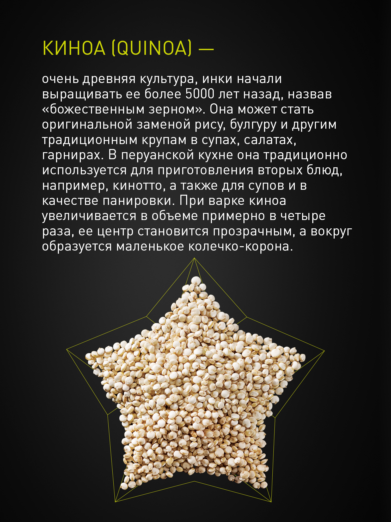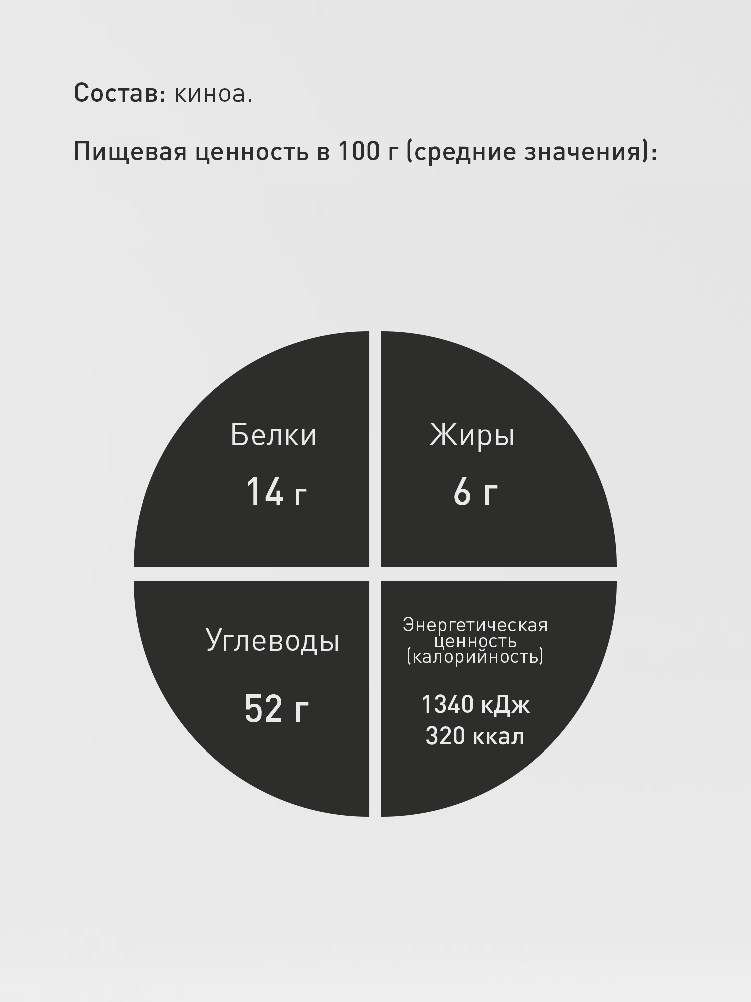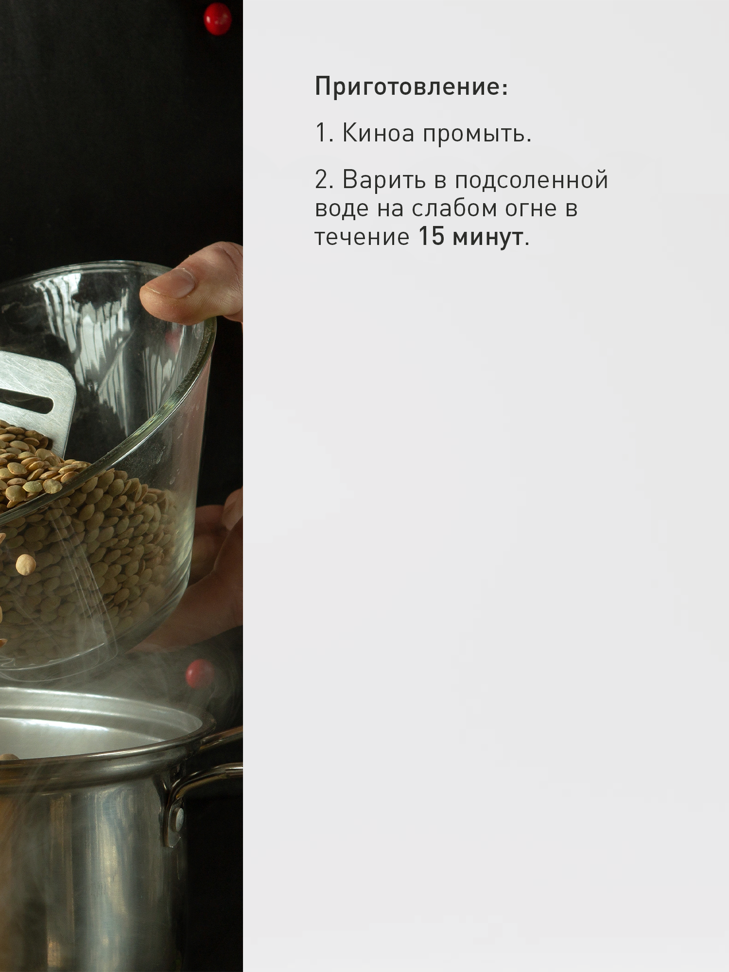 | Способ приготовления | Киноа промыть и варить в подсоленной воде на слабом огне в течение 15 минут. |
