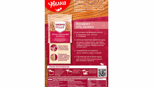 | Способ приготовления | поместить пакетик в кипящую подсоленную воду (750 мл); варить на умеренном огне 15 минут; достать пакетик вилкой, подцепив его за петлю; дать воде стечь; вскрыть пакетик по линии перфорации и выложить готовую крупу на блюдо |
