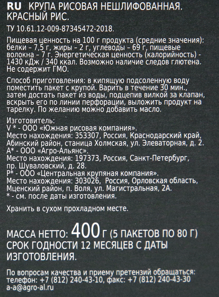 | Состав | Крупа рисовая нешлифованная. Красный рис, 100 % |