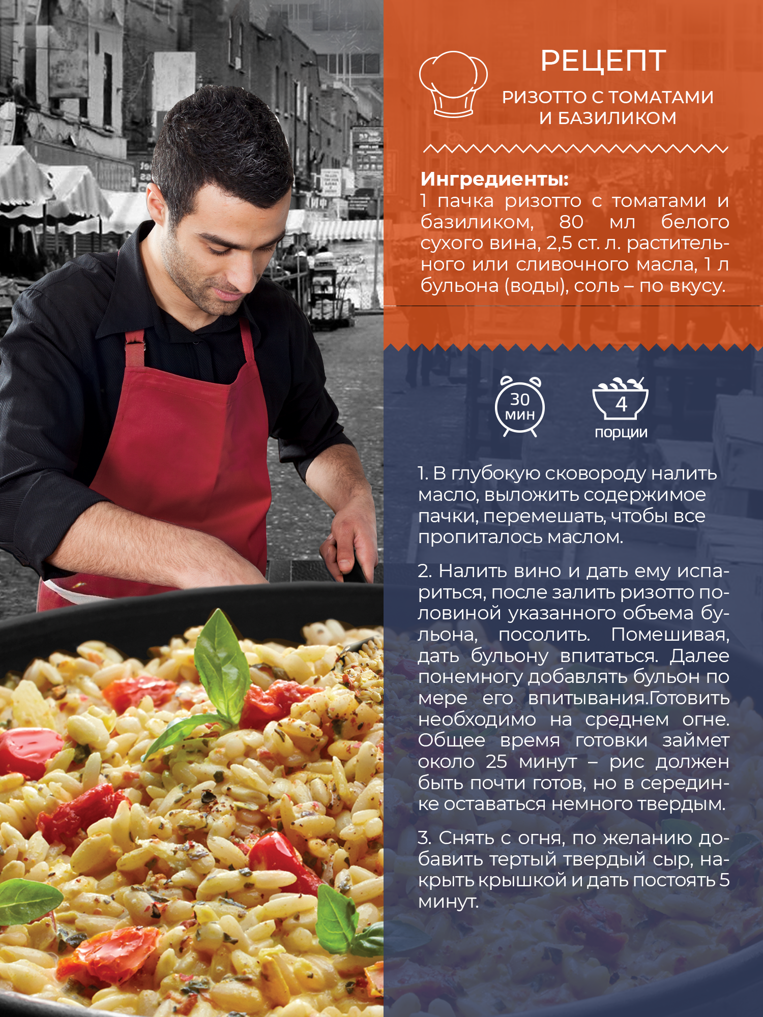 | Способ приготовления | В глубокую сковороду налить 2,5 ст. л. растительного масла, выложить содержимое пачки, перемешать, чтобы все пропиталось маслом. Налить 80 мл белого сухого вина и дать ему испариться, после залить ризотто 0,5 л бульона (воды), посолить. Помешивая, дать жидкости впитаться. Далее понемногу добавлять еще 0,5 л бульона (воды) по мере впитывания. Готовить необходимо на среднем огне. Общее время готовки займет около 25 минут – рис должен быть почти готов, но в серединке оставаться немного твердым. Снять с огня, по желанию добавить тертый твердый сыр, накрыть крышкой и дать постоять 5 минут. |