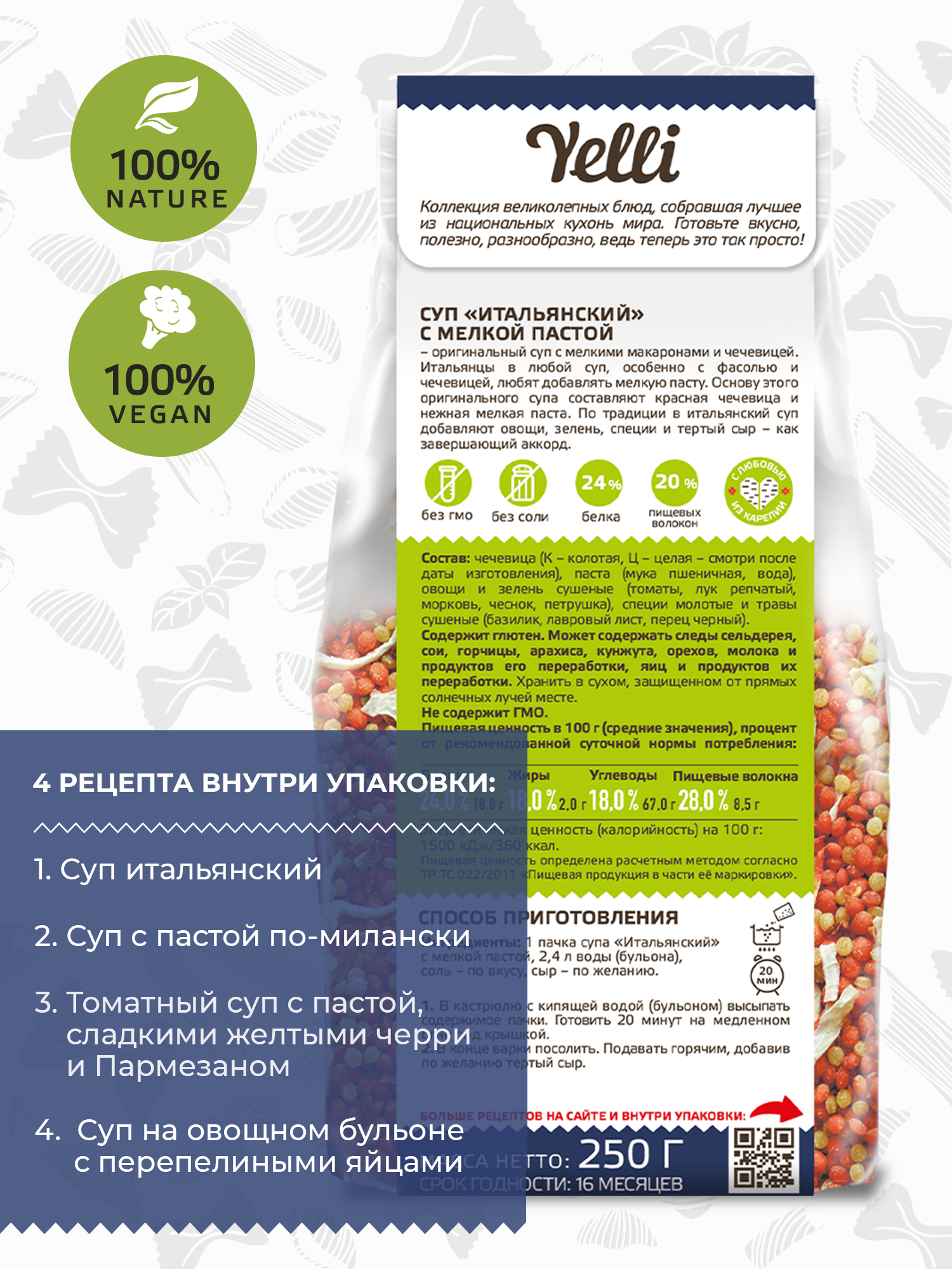 | Состав | чечевица, паста (мука пшеничная, вода), овощи и зелень сушеные (томаты, лук репчатый, морковь, чеснок, петрушка), специи молотые и травы сушеные (базилик, лавровый лист, перец черный). Продукт содержит глютен, может содержать следы сельдерея, сои, горчицы, арахиса, кунжута, орехов, молока и продуктов его переработки, яиц и продуктов их переработки. |