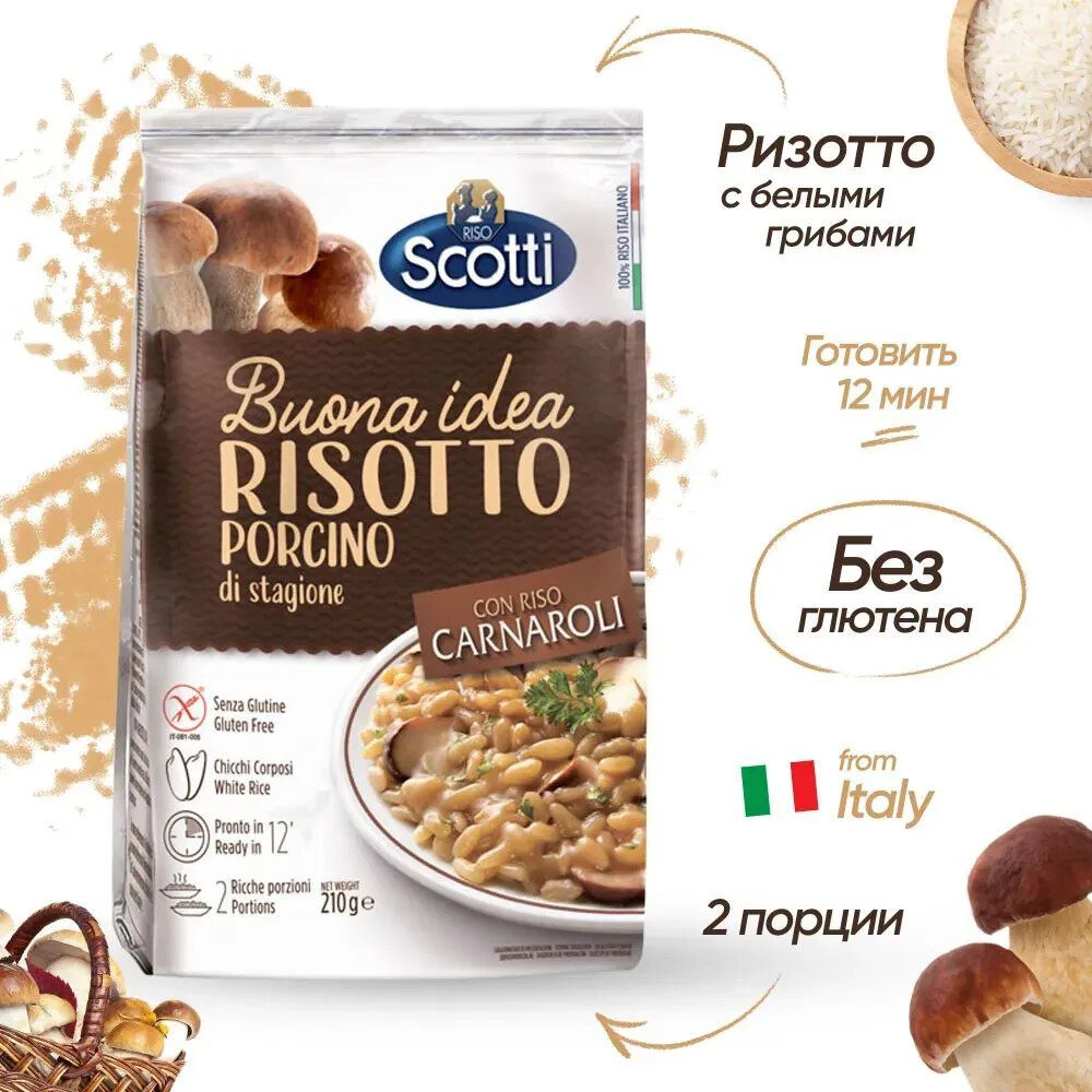 Рис белый Карнароли, Ризотто с белыми грибами 4 шт, Riso Scotti Risotto Al Porcino, 210 г., без глютена/Готовый гарнир и итальянское блюдо